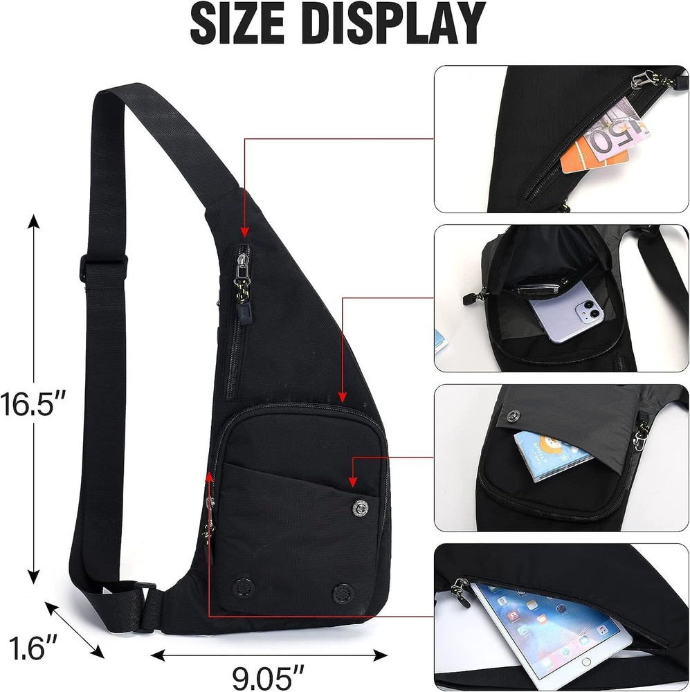 MULTIPLE POCKETS FOR LARGE CAPACITY- This sling bag designed with multiple pockets - 1 main compartment with a built-in pocket, 2 zipper pocket with slots for your wallet and cards, 1 buckle front pocket for easy access. A perfect size to hold your wallet, cash, phone, cards, passport, and any essentials in everyday life. SLIM BODY BAG- Upgraded slim body of the sling bag weight only 0.35lbs, helps relieve the stress from your shoulders and makes it comfortable to wear even when loaded with your gear. Small body but feturing massive independent storage space, tiny body attach to your body tightly, ensuring bounce-free and comfortable wearing. HIGH-QUALITY NYLON MATERIAL- SIZE:9.05” x 16.5” x 1.6”. Crossbody bag for man and women is made of high quality nylon, which is strong, sturdy, water resistant and anti-srcatch. Longevity is further enhanced by bar-tacks at major stress points, making sure the men sling bag is not easy to break and tear providing a secure and comfortable using experiment. DURABLE ZIPPER & BUCKLE - Our cross body bag featured with durable zippers and buckles. Focus on quality control and quality materials insure that every zipper fits and performs perfectly, every time. A smooth zipper for easy access to your items and never be afraid of losing. Strong buckles, easy to adjust, you can wear the sling bag tight or loose, up or down. SUITABLE FOR ANY OCCASIONS - Aim to provides you the highest quality products with careful details, we designed this small lightweight sling bag with multi-pocket, so you can easily keep your items in order and enjoy a pleasant and relaxed workout experience. Perfect for running, hiking, camping, fishing, sight-seeing, travel, beach and any outdoor activities.