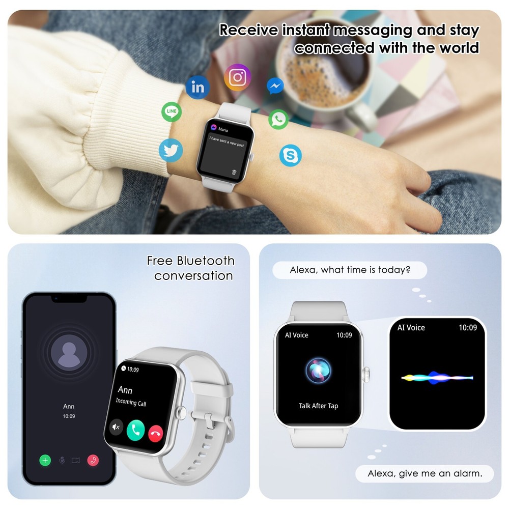Smart Watch For Women/Men Waterproof Smartwatch Bluetooth iPhone Samsung Android 【Bluetooth Call and Voice Assistant】 Smart Watch Has a Built-in Microphone and Hd Speaker, Adopt Bluetooth Version 5.3 for Faster Connectivity. so You Can Make and Receive Calls Directly from This Smart Watch for Men. You Can Also Use the Built-in Voice Assistant to Ask Questions, Control Music Playback, Check the Weather, Set Alarms and Timers, Etc. When Your Phone Receives a Call or Message (Such As Whatsapp, Facebook, Instagram, Etc.), the Smartwatch Issues a Real-time Notification. 【1.85'' Hd Touch Screen and Diy Dial】 Smart Watches for Men Are Equipped with a 1.85-Inch Extra Hd Lcd and a Tft High-resolution Color Display. Superior Picture Quality and Touch Sensitivity Bring You Crystal-clear Visuals like Never Before. the Smart Watch Has More than 100 Unique Watch Faces to Choose from. You Can Also Customize Your Favorite Pictures As Watch Faces on the ‘’Da Fit‘’ App and Even Upload Your Photos, Such As Selfies or Pictures of Your Pets, to Create a Truly Personalized Look with Endless Possibilities. 【24/7 Health Monitor】 the Iowodo Smartwatch Has a Built-in Optical Tracking Sensor That Automatically Monitors Health Levels for Heart Rate in Real-time 24/7. It Can Also Accurately Track Your Sleep and Detect Blood Oxygen Saturation and Stress Levels. the "Da Fit" App Even Offers a Detailed Sleep Quality Analysis Report (Light/Deep/Awake Sleep Stage), and You Can View Further Health Data to Help You Analyze Your Health Status and Make Appropriate Adjustments in Good Time Towards a Healthier Lifestyle. (*Note: This Watch Cannot Be Used As a Medical Diagnostic Tool.) 【Battery Life】 the Smart Watch Has a Built-in 350 Mah Rechargeable Battery That Can Be Fully Charged in Just 2.5 Hours and Minimizes Power Consumption. Under Normal Use, the Battery Life Is up to 5-7 Days(Depending on Actual Use). in Standby Mode, It Can Be Used Continuously for up to 25 Days. with Our Smart Watches for Men, You Can Say Goodbye to Battery Anxiety. 【100+ Sports Modes】 the Fitness Watch with More than 100 Sports Modes, This Fitness Tracker Supports Treadmill, Walking, Outdoor Training, Running, Cycling, Climbing, Yoga, Skiing, Football, and More. It Precisely Tracks Your Daily Data Such As Steps, Time, Distance, and Calories, and Connects to the Gps on Your Phone to Record All Your Training Routes and Fitness Using the "Da Fit" App to Further Motivate Yourself to Complete Your Exercise Plan. It's an Ip68 Waterproof Device That Can Meet Your Daily Needs. (*Note: Not for Sauna, Hot Water, Swimming, Diving) 【Broad Compatibility】 Works Seamlessly with Ios or Android Smartphones. Compatible with Ios 9.0 or Above, Android 6.0 or Above (Not Suitable for Pcs or Tablets). Our Smart Watch Has an"Fsc-certified Case and Bracelet". 【More Efficient Life and 2 Straps】 the Fitness Watch Has Many Built-in Functions, Including Smart Notifications, Music Control, Camera Control, Weather Forecast, Sedentary Reminders, Alarm Clock, Stopwatch, Timer, Etc. Lift Your Wrist and Read All the Incoming Calls, Text Messages, and Messages Sent to the Smartwatch Screen Directly. in Addition, Equipped with 2 Comfortable and Skin-friendly Wristbands (Silicone Strap and Nylon Strap), the Length Can Be Adjusted Freely. Users with Sensitive Skin Can Use the Nylon Strap, Which Directly Helps You Solve Skin Sensitivity Problems, and Smart Watches for Men to Help You Exercise Scientifically. 【24-Hour After-sales Service】 We Provide a Long After-sales Cycle and Complete Customer Service. If You Have Any Problems When Using the Smart Watch, Please Contact Us Immediately. We Will Reply to You Within 24 Hours and Help You Solve the Problem As Soon As Possible! 🎁 Fantastic Gift for Your Family and Friends💝 Packing List: 1 x Smart watch 1 x Replacement strap 1 x Charging cable 1 x User Manual Operation guidance: Strap Material Silicone Size As shown in the figure MPN NOT SPECIFIED Case Color Gray Manufacturer Warranty 1 Year Network Bluetooth Features Blood Oxygen Sensor, Bluetooth Enabled, Caller ID, Fitness Tracker, Heart Rate Monitor, Sleep Monitor, Touchscreen, Waterproof, Water-Resistant Case Size 22MM Operating System Android Wear Storage Capacity 1 GB Case Material Aluminum APP Name Da fit Compatible With Android 6.0 & iOS9.0 above Screen Size 1.85 Inches Material Silicone Brand Blackview Series Military Smart Watch Type Smart Watch Battery Capacity 350mAh Band Color Gray Band Material Silicone Compatible Phone Models For IOS, Android Design/Finish HD Touch Screen Model Military Smart Watches Country/Region of Manufacture United States Compatible Operating System iOS - Apple, Android Connectivity Technology Bluetooth 5.0