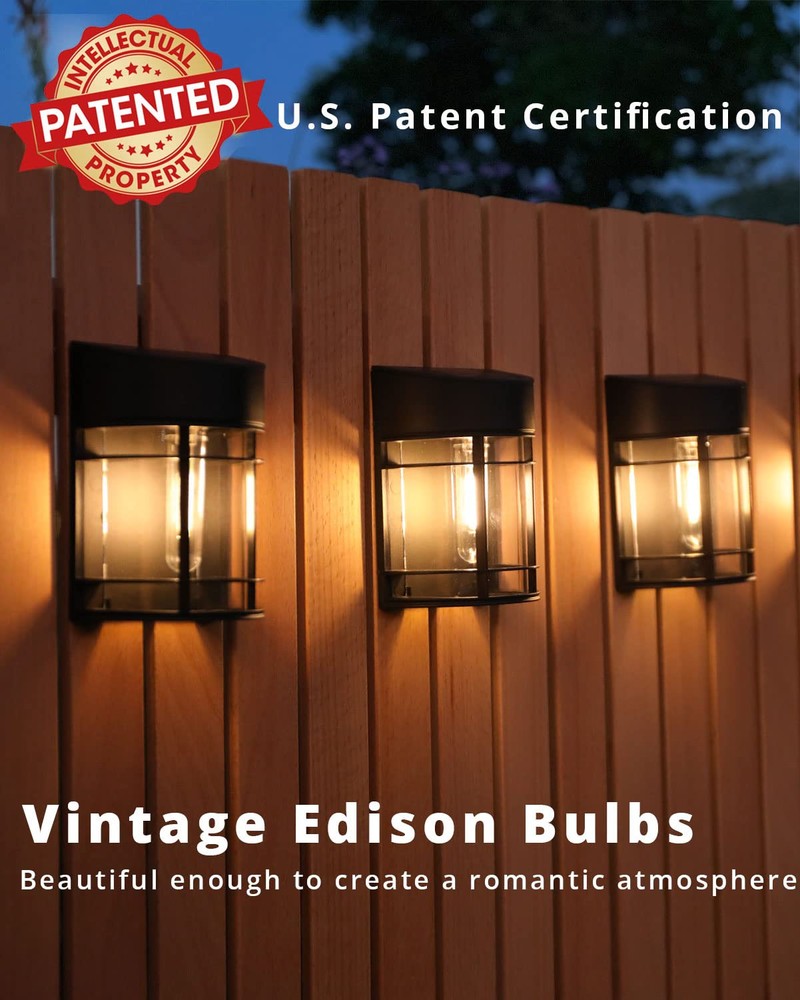 Vintage Brown Fence lights - Give off beautiful Warm, and soft lighting, makes your garden look nicer, cozier, and more inviting. Energy-saving, No Heat and long lifespan means no bulbs to replace. (3000K warm white light). Design with U.S. Patent Certification Auto ON/Off & Dusk to Dawn - Solar fence lights automatically turn on at dusk and off at dawn, provide brighter and all night lillumination for fence deck yard. No electric bill, Saving money and no need to manually turn it on/off everyday.(Turn ON the switch for the first time) High Efficiency Energy Saving - New Solar Panel perform better with higher conversion efficiency that up to 50% than others. Durable enough to extend the lifespan. Recharge battery charged 8-10hour in daytime to store electricity, maximize and long-lasting the power for fence lights at night. Easy Installation- NO wires. simply using the included screws to fix on any wall, fence deck or pole. Measures: 5.1x3.6x2.4 Inch. The perfect addition to your yard fence Wall Patio Stairs. When darkness was descending, backyard lights giving the garden many eye-pleasing luminous decoration. Distance between two holes: 2.8 inches All-Weather Resistant - Made of durable ABS material, stable and durable for maximum performance. IP44 waterproof solar outdoor lights work well on all kinds of weather, such as snow, rain or extreme weather.