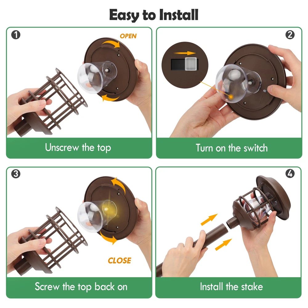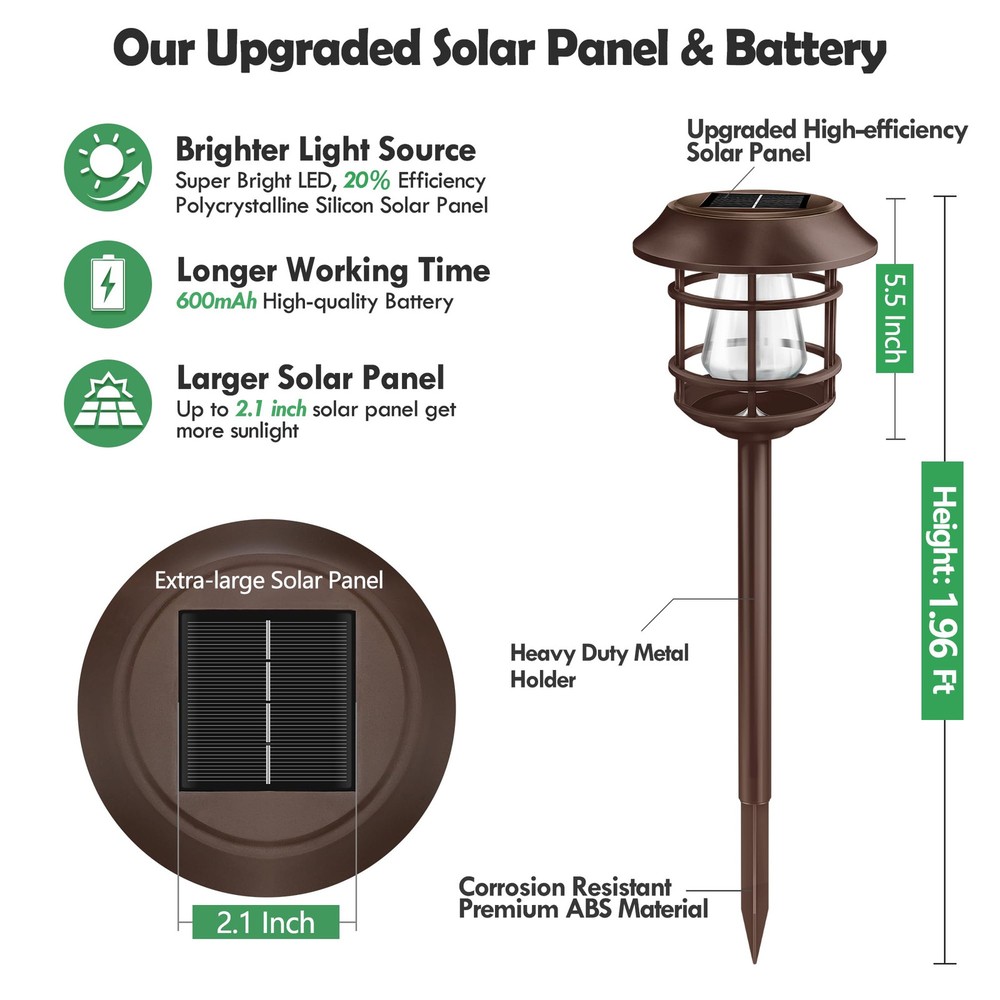 【Special Large LED Bulb Design and Unique Light Pattern】: Featured with a super bright LED and special bulb design, this solar lawn light will cast a stunning light pattern on the ground, 3 times brighter than standard solar garden lights. Illuminate your walkway, frame your garden, perfect for enhancing the ambiance of your front door, deck, lawn, backyard, pathway, driveway, patio, or garden. 【Warm Light, Auto On/Off from Dusk to Dawn】: The automatic solar-powered feature ensures it turns on at night and off at dawn, providing up to 10-12 hours of continuous lighting while saving on your electricity bills. Powered by solar, large batteries, no electricity needed, energy conservation. Green energy and environmental protection. 【1.96 Feet Taller and Larger Lights with Upgraded Solar Panel】: Made of premium material, combines modern and sleek designs, black finish/brown finish enhances durable look. Built to withstand all seasons, this solar pathway light boasts an upgraded solar panel and a 600mAh battery, significantly enhancing its light output. 【Wire-Free, Easy to Install and Use】: Say goodbye to complicated wiring with these solar lights. It can be placed anywhere as long as it receives sunlight. No outlets or tools required. Regardless of the outlet's location or distance, installation and usage are hassle-free. Simply assemble the stakes and insert it into the ground. 【Convenient and Safe】: Waterproof IP64, this outdoor solar pathway light is built to withstand various weather conditions and maintain optimal performance over an extended period. With Overcharge, over-discharge, over current protection, our solar light ensures safety while installing in your garden.