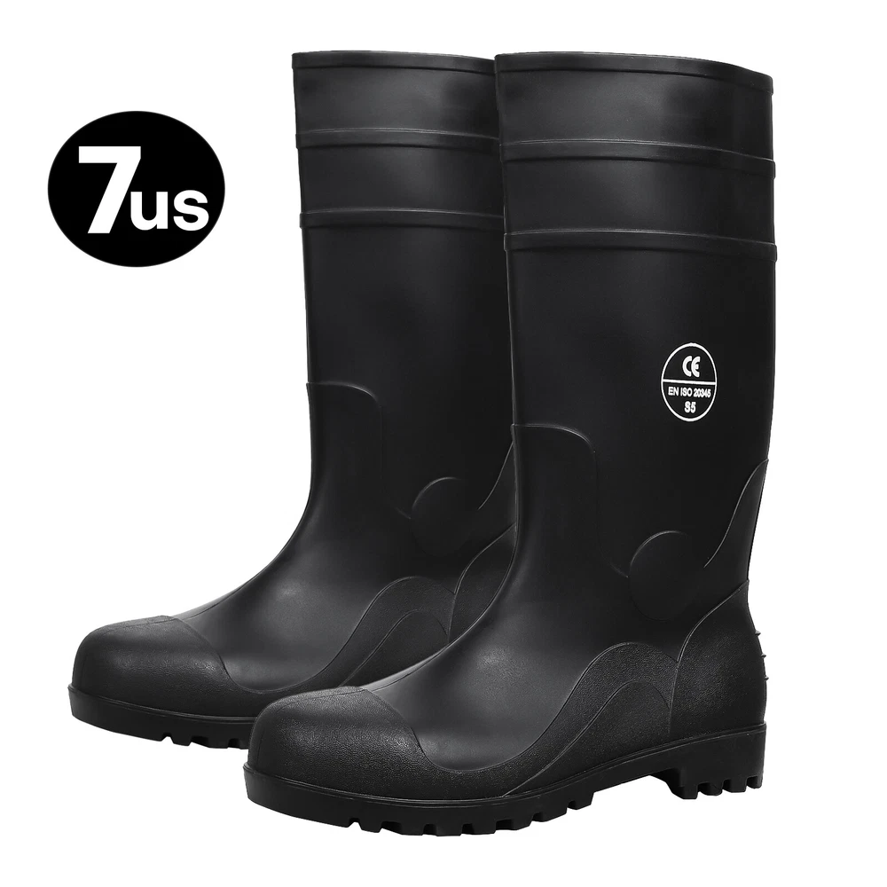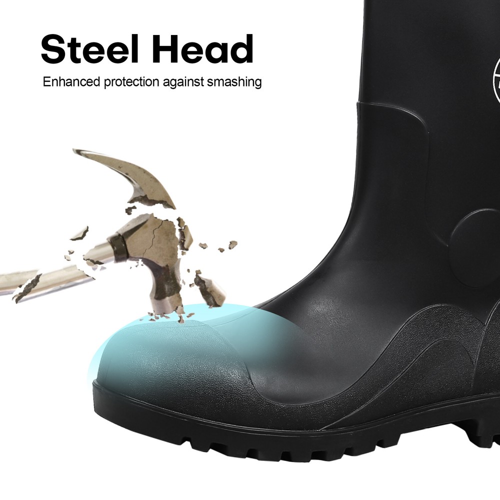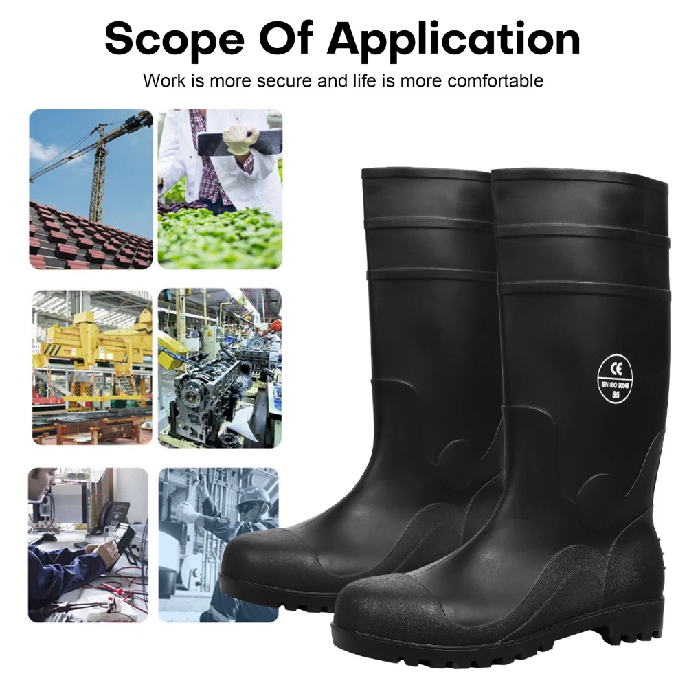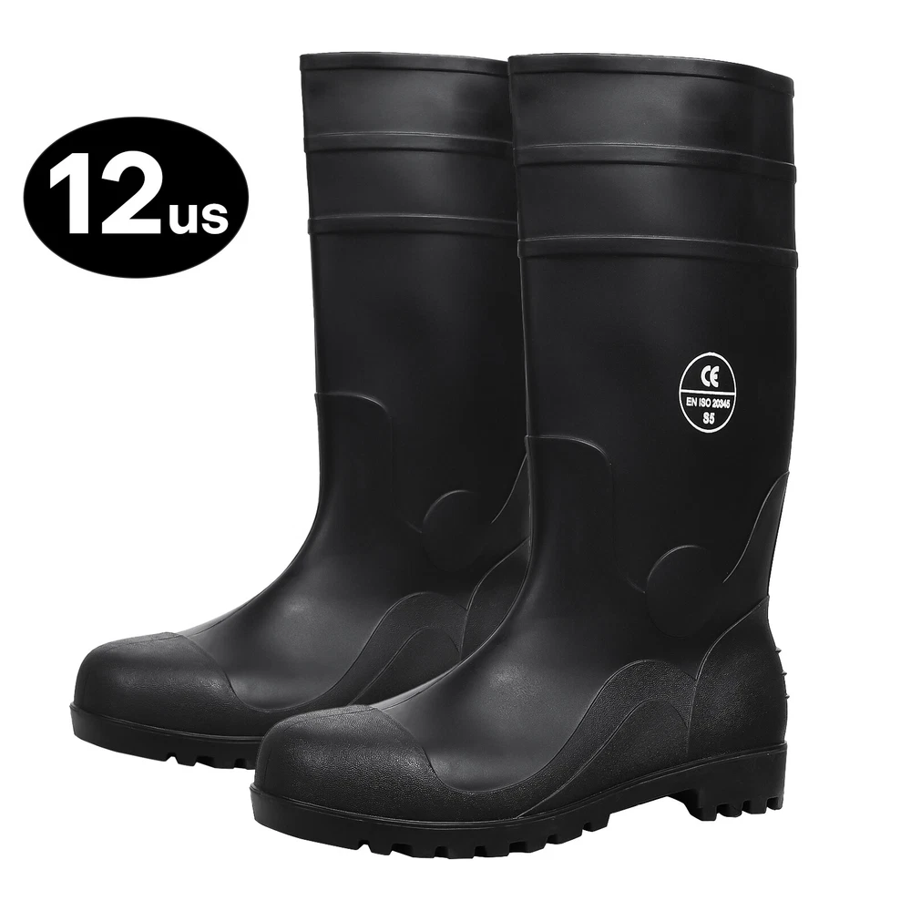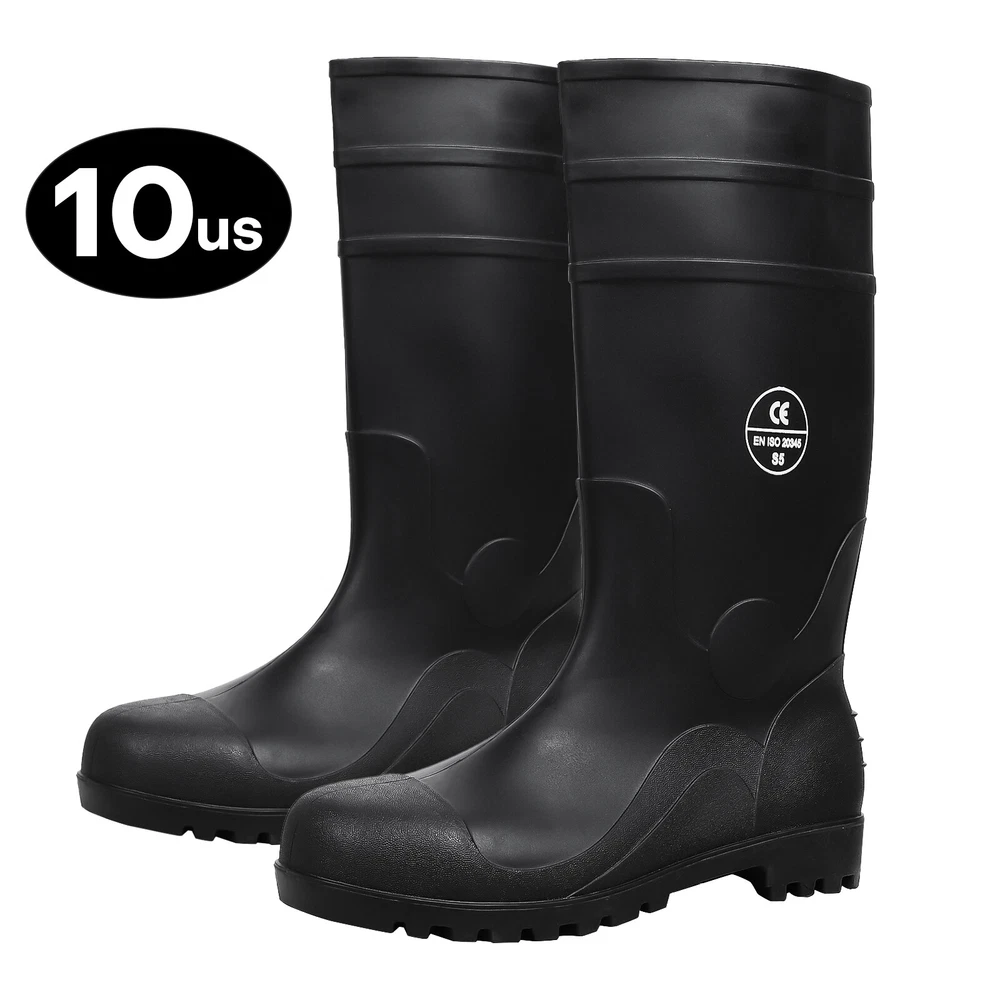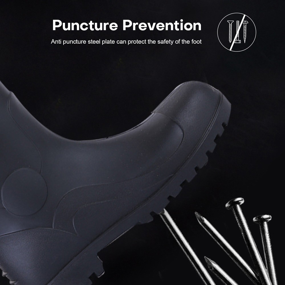 Full Sizes Waterproof Rubber Rain Boots Anti-slip Work Safety Boots w/Steel Toe Features Puncture-Resistant These work boots feature a steel toe and steel sole design, offering protection against accidental impact and puncture High Quality. The outer layer of the work boots is made from high-quality rubber material, which is slip-resistant, oil-resistant, and durable, providing stability and durability in a wide range of work environments. Waterproof The high-top design of the work boots is waterproof, preventing rainwater and mud from entering the boots and keeping your feet dry and comfortable. Breathable The interior of the work boots is designed with breathable mesh fabric, keeping your feet dry and ventilated, reducing odor and bacteria growth. Upgrade Design The design of the work boots is ergonomic, providing comfortable foot support and shock absorption, reducing the risk of foot fatigue and injury. Wide Application These work boots are suitable for a variety of work environments, including construction sites, factories, docks, and fishing boats. Specification Material:PVC rubber Color:Black Size: US 7-13 Features: Steel toe,waterproof,anti-slip,breathable,Puncture-Resistant Application:farm work, hunting, hiking,construction,Gardenning,landscaping Package include 1x pair boot