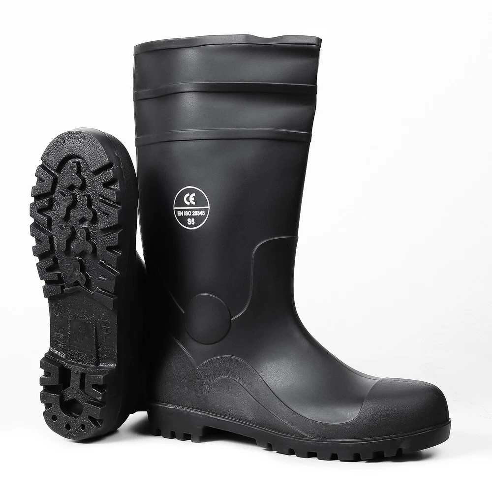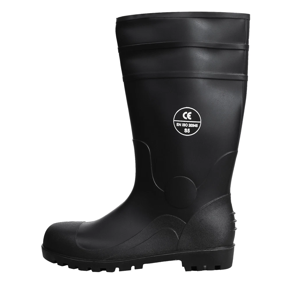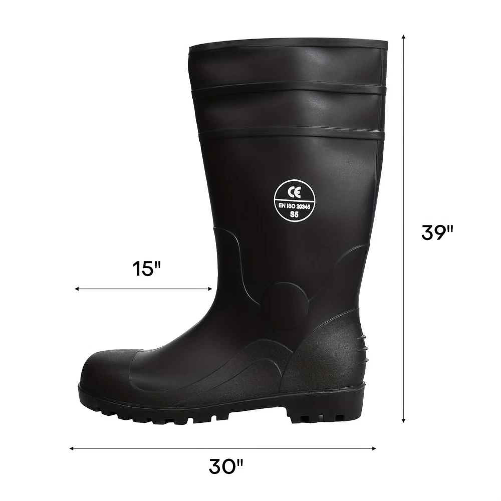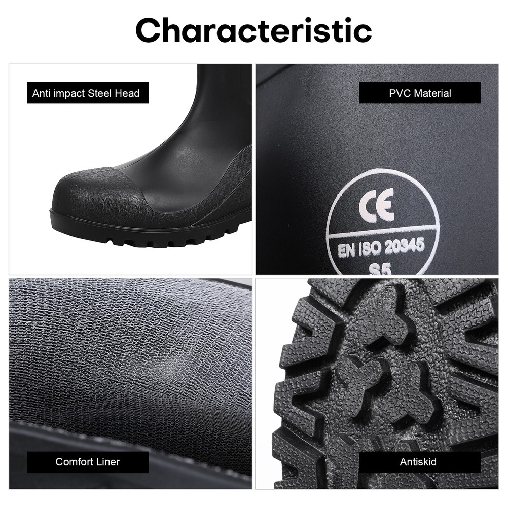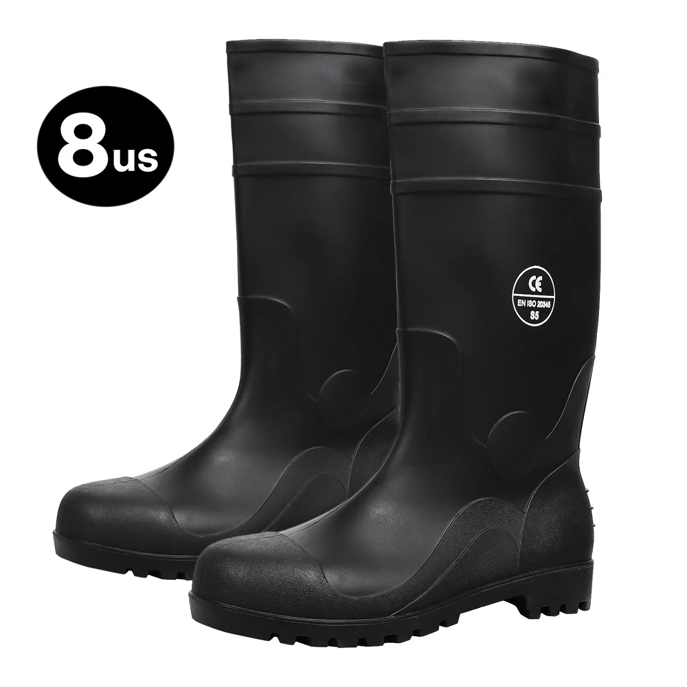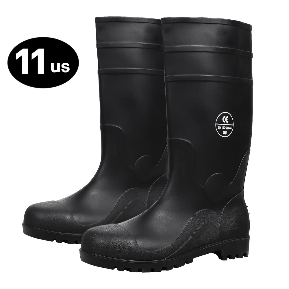 Full Sizes Waterproof Rubber Rain Boots Anti-slip Work Safety Boots w/Steel Toe Features Puncture-Resistant These work boots feature a steel toe and steel sole design, offering protection against accidental impact and puncture High Quality. The outer layer of the work boots is made from high-quality rubber material, which is slip-resistant, oil-resistant, and durable, providing stability and durability in a wide range of work environments. Waterproof The high-top design of the work boots is waterproof, preventing rainwater and mud from entering the boots and keeping your feet dry and comfortable. Breathable The interior of the work boots is designed with breathable mesh fabric, keeping your feet dry and ventilated, reducing odor and bacteria growth. Upgrade Design The design of the work boots is ergonomic, providing comfortable foot support and shock absorption, reducing the risk of foot fatigue and injury. Wide Application These work boots are suitable for a variety of work environments, including construction sites, factories, docks, and fishing boats. Specification Material:PVC rubber Color:Black Size: US 7-13 Features: Steel toe,waterproof,anti-slip,breathable,Puncture-Resistant Application:farm work, hunting, hiking,construction,Gardenning,landscaping Package include 1x pair boot
