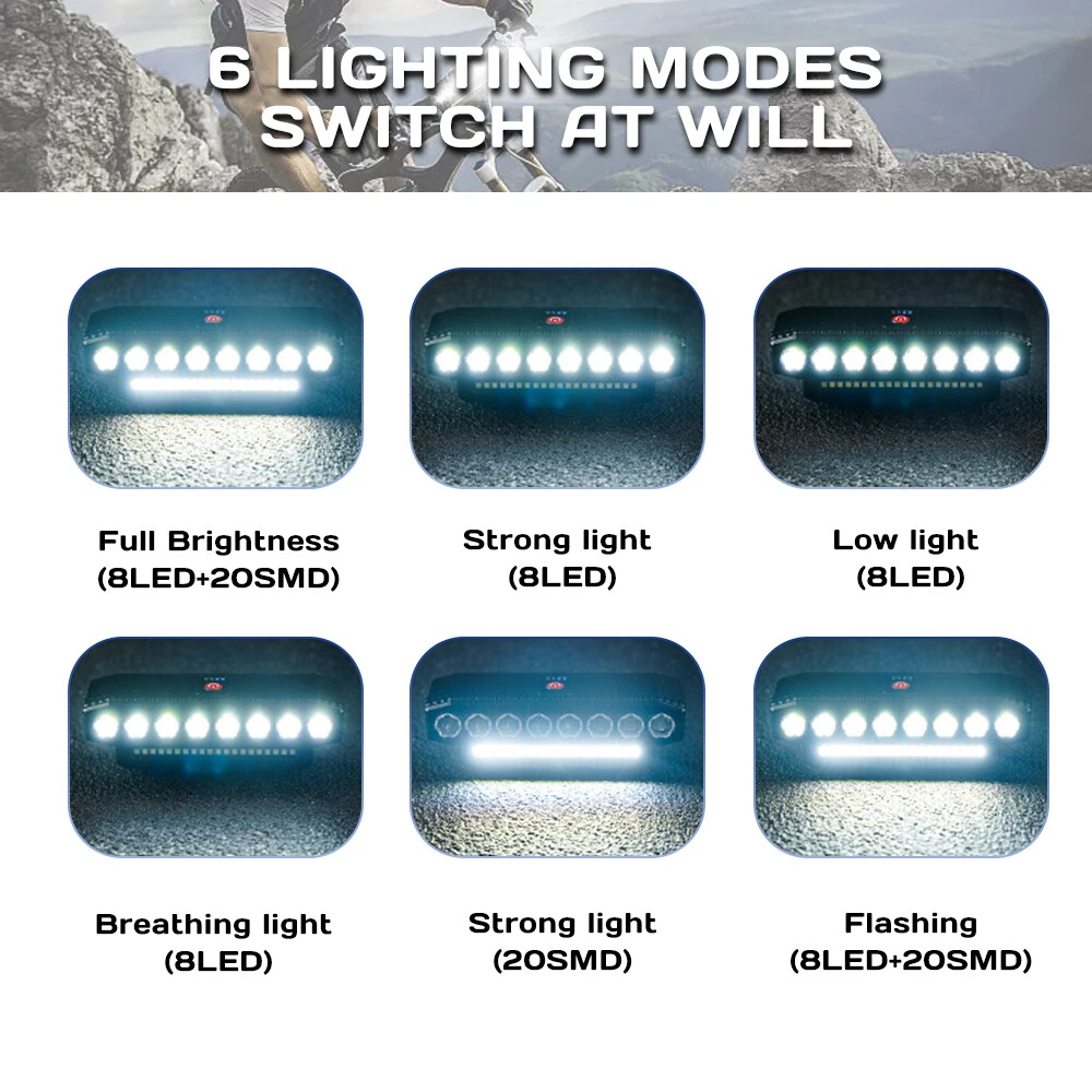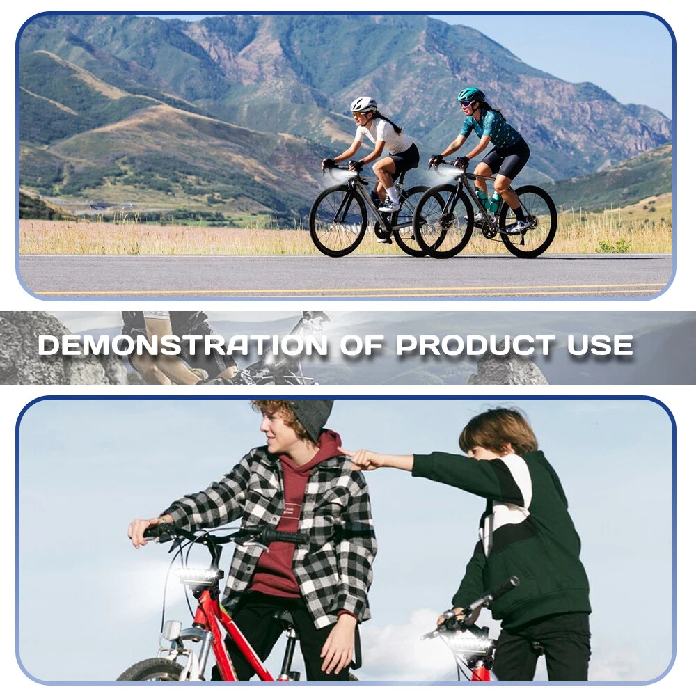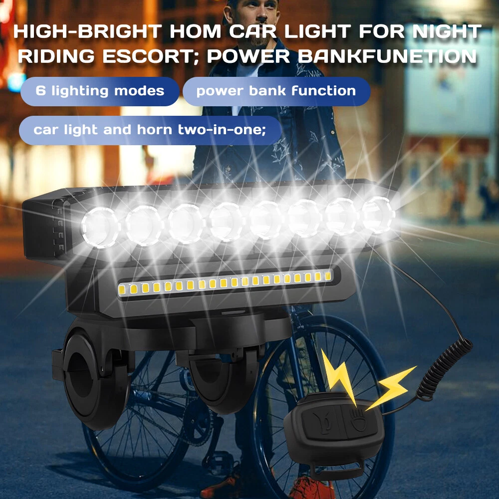 【 Super Bright 】Bike lights is very bright with the maximum output is 9500 lumens, the 8 led and 20 smd lights cover a wide range up to 800m,bike headlight allows you to ride at night to see wider and further areas, also makes your night riding safer. 【 Charging Input and Output 】In addition to the normal usb input rechargeable function,this bike headlight also has a USB output function.Bike light has a power bank function that can charge your phone.This is a very important when you are riding outdoors. 【 Multiple M odes 】6 lighting modes, which can adapt to different scenes. Besides being used as a bicycle light, you can also use it for camping, fishing, night work and activities,bike lights for night riding has a high decibel speaker, and equipped with a wired button switch, making your operation more convenient and safe 【 Waterproof and Durable 】Bike headlight made from high-quality materials, the bike lights are designed to withstand bike、bicycle、 riding、mountain cycling accessories,bike headlight with IP44 waterproof ratings, bicycle lights front and rear can handle rain, snow, and other outdoor elements. Specification: Beads: 8LED+20SMD Material: ABS Modes: 6 modes (8LED+20SMD full bright-8LED strong light-8LED weak light-8LED breathing light-20SMD strong light-8LED+20SMD burst flash) Charging mode: USB charging Battery capacity: 4000 mAh Waterproof: IP44 Speaker: 130db Product size: 138*40*51mm Package Included: 1 x Bicycle light 1 x Horn