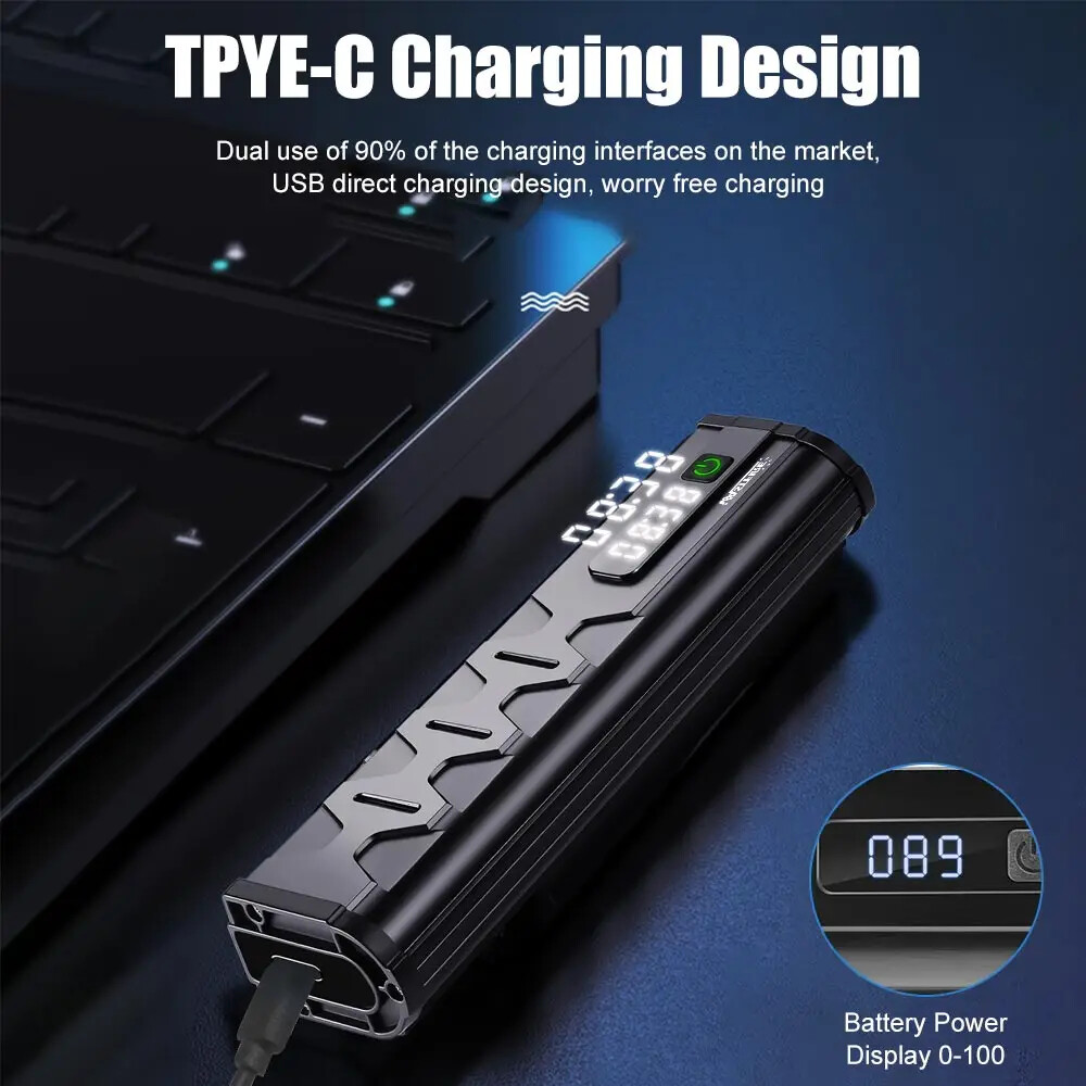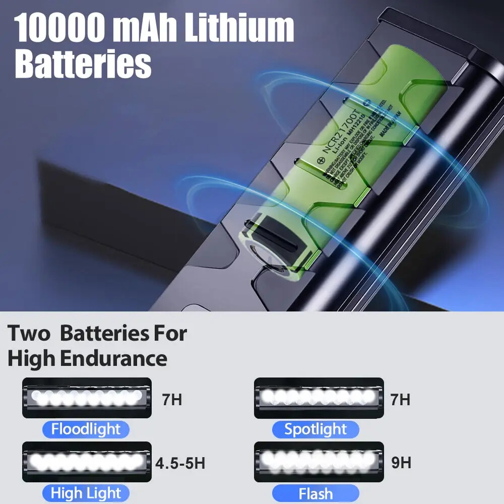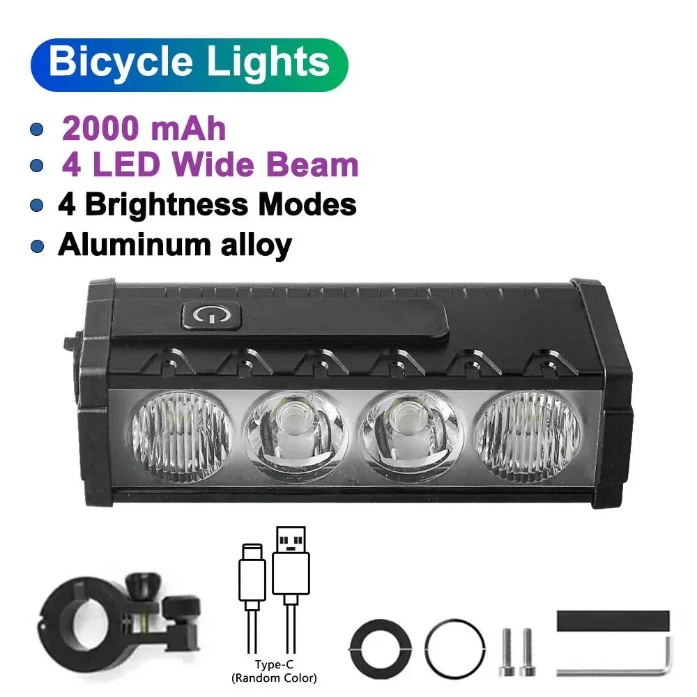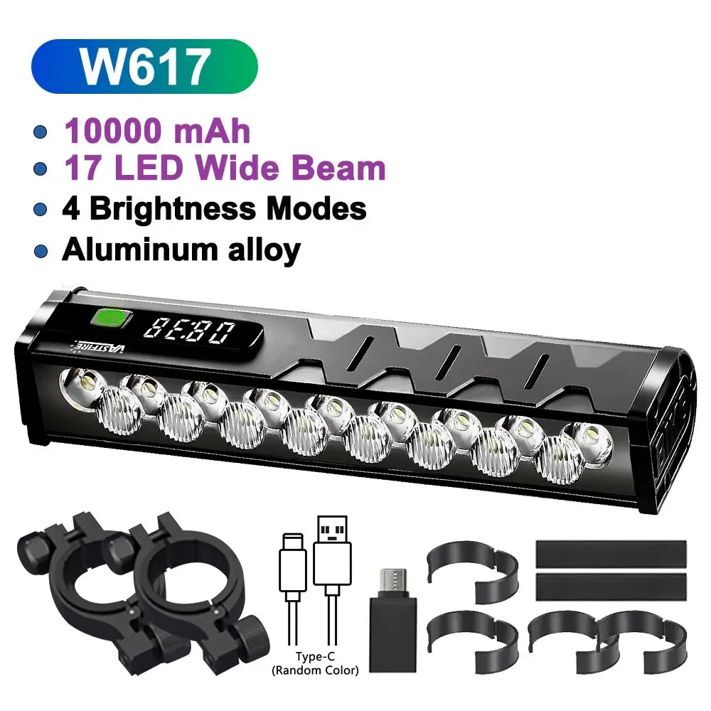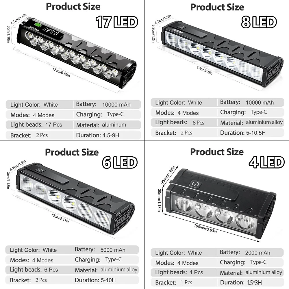 Specification: Material: aluminum + plastic Light color: white Product color: black Light Beads: 17*leds Mode: Flood 8 lights on - Spot 9 lights on - 17 lights on - 17 lights flashing Lumen: 25500LM Charging mode: Type-C charging Battery capacity: 10000 mAh Charging time: 5-7H Use time: 4.5-9H Voltage: 3.7V Waterproof: IP65 Net weight: 330g Size: 17*4.7*3cm Package A: 1*Bicycle headlight 1*Type-C charging cable 1*USB conversion head 1*Bracket