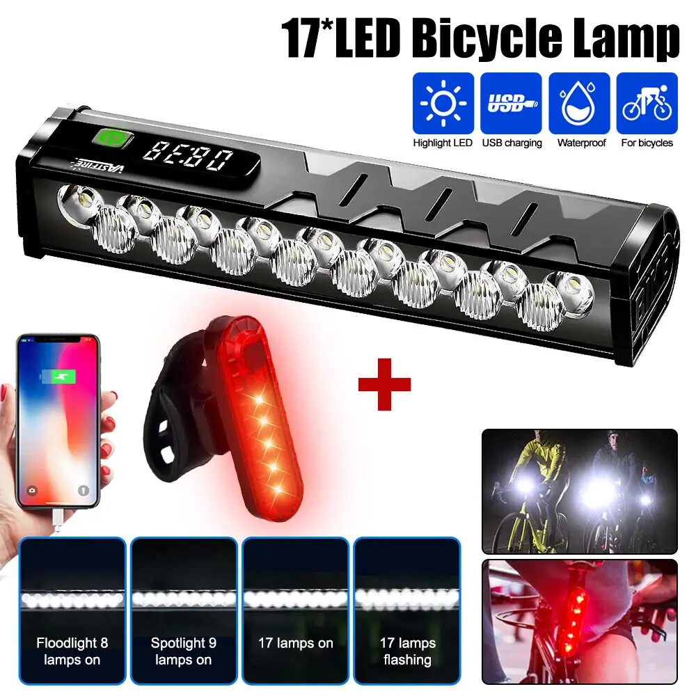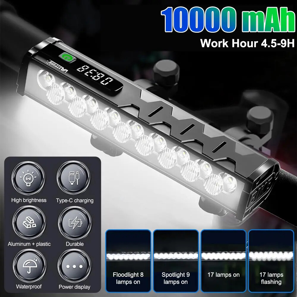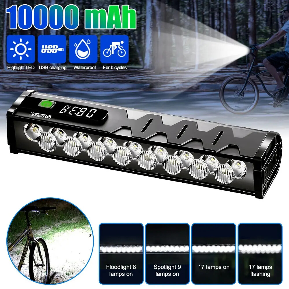 17leds bike lights 10000 mAh headlight Specification: Material: aluminum + plastic Light color: white Product color: black Light Beads: 17*leds Mode: Flood 8 lights on - Spot 9 lights on - 17 lights on - 17 lights flashing Lumen: 25500LM Charging mode: Type-C charging Battery capacity: 10000 mAh Charging time: 5-7H Use time: 4.5-9H Voltage: 3.7V Waterproof: IP65 Net weight: 330g Size: 17*4.7*3cm Package A: 1*Bicycle headlight 1*Type-C charging cable 1*USB conversion head 1*Bracket Package B: 1*Bicycle headlight 1*Type-C charging cable 1*USB conversion head 1*Bracket 1*Tail light