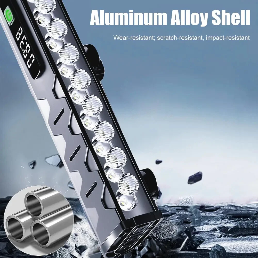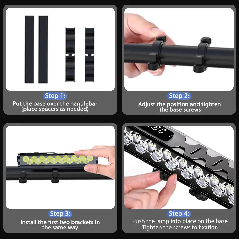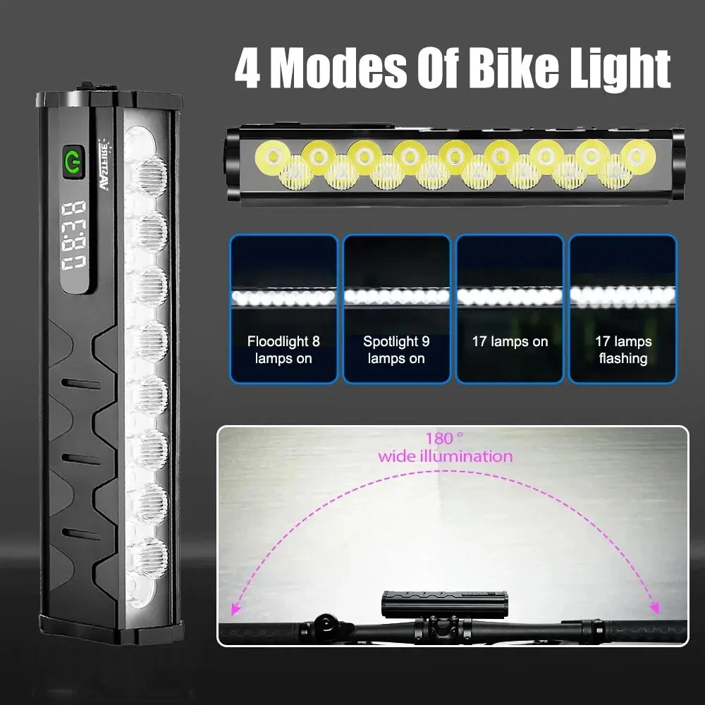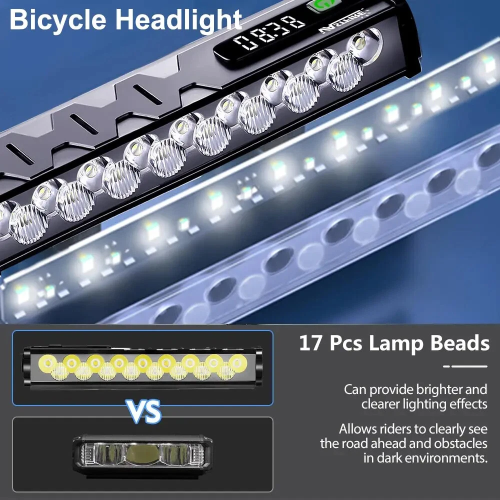 17leds bike lights 10000 mAh headlight Specification: Material: aluminum + plastic Light color: white Product color: black Light Beads: 17*leds Mode: Flood 8 lights on - Spot 9 lights on - 17 lights on - 17 lights flashing Lumen: 25500LM Charging mode: Type-C charging Battery capacity: 10000 mAh Charging time: 5-7H Use time: 4.5-9H Voltage: 3.7V Waterproof: IP65 Net weight: 330g Size: 17*4.7*3cm Package A: 1*Bicycle headlight 1*Type-C charging cable 1*USB conversion head 1*Bracket Package B: 1*Bicycle headlight 1*Type-C charging cable 1*USB conversion head 1*Bracket 1*Tail light