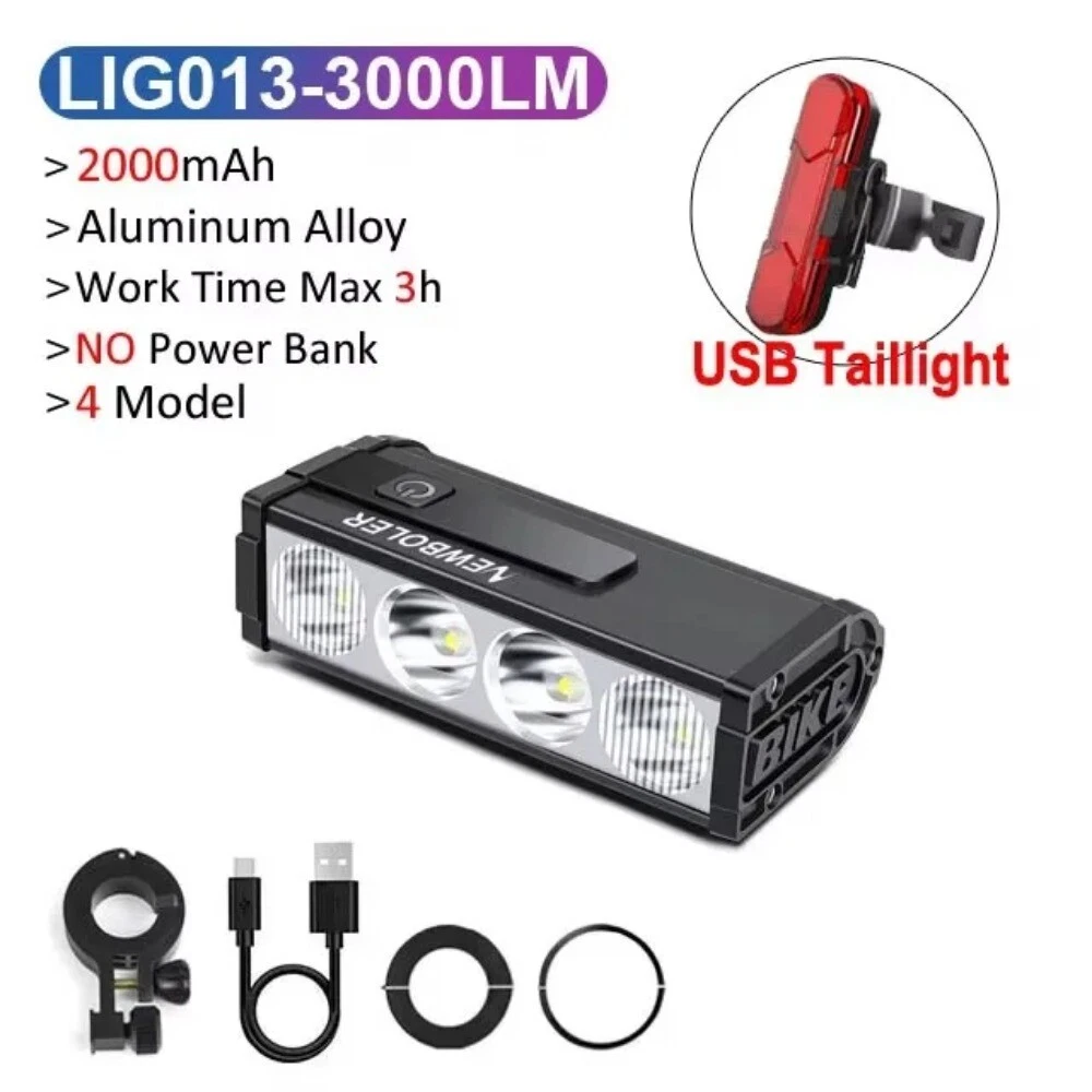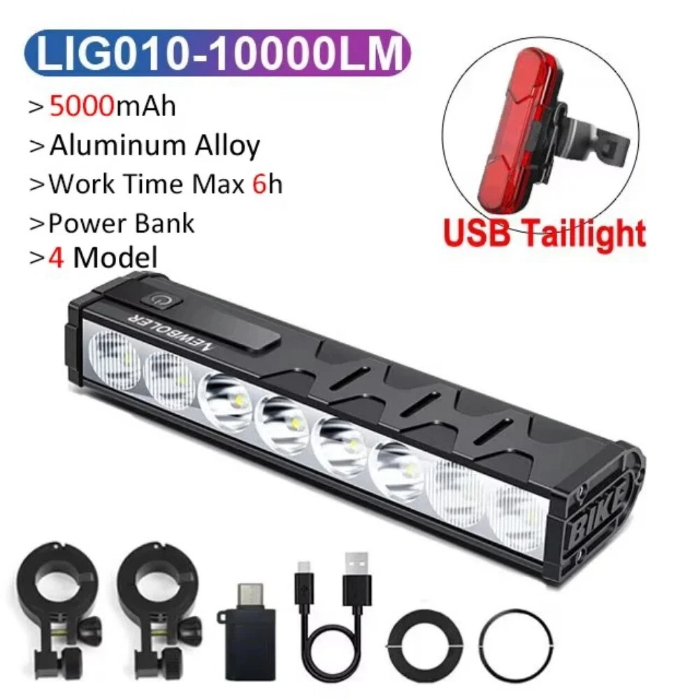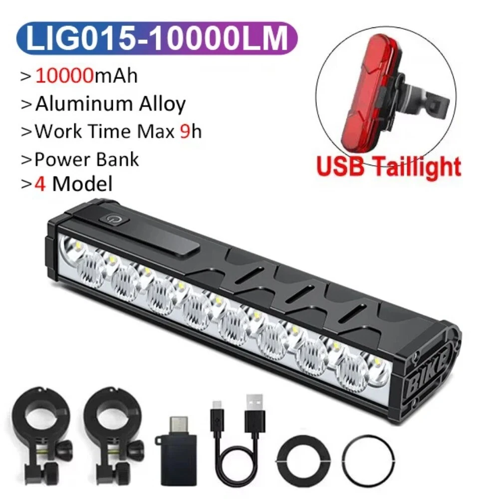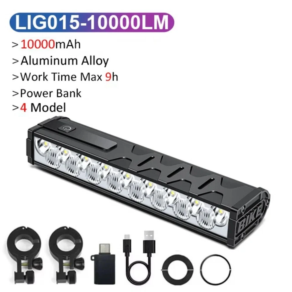 WARNING 1. Please use a 5V/2A charger, fast charging is not supported. 2. Do not look directly into the beam or shine into the eyes of others. Product details: Model: LIG013-2000mAh Material: Aluminum allyo Mode:4 Modes,Near light - High beam bright - Far and Near full light - Flashing Waterproof: IPX5 Lumen: Max 3000Lumen Battery: About 2000 mAh Charging Time: About 4 hrs Working time: 1.5-3h Voltage: 5V/2A Power bank: NO Model: LIG010-5000mAh Material: Aluminum allyo Mode:4 Modes,Near light - High beam bright - Far and Near full light - Flashing Waterproof: IP65 Lumen: Max 10000Lumen Battery: About -5000 mAh Battery type: 1 * 21700 Charging Time: About 4 hrs Working time: 2-6h Voltage: 5V/2A Power bank: YES Model: LIG010-10000mAh Material: Aluminum allyo Mode:4 Modes,Near light - High beam bright - Far and Near full light - Flashing Waterproof: IP65 Lumen: Max 10000Lumen Battery: About 10000 mAh Battery type: 2 * 21700 Charging Time: About 8 hrs Working time: 4.5-10.5h Voltage: 5V/2A Power bank: YES Model: LIG015-10000mAh Material: Aluminum allyo Mode:4 Modes,Near light - High beam bright - Far and Near full light - Flashing Waterproof: IP65 Lumen: Max 10000Lumen Battery: About 10000 mAh Charging Time: About 5-7 hrs Working time: 4.5-9h Voltage: 5V/2A Power bank: YES Please note that it is not 100% waterproof. Please do not use it for a long time on rainy days or put it into water