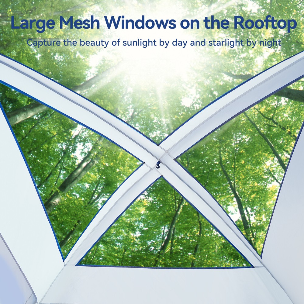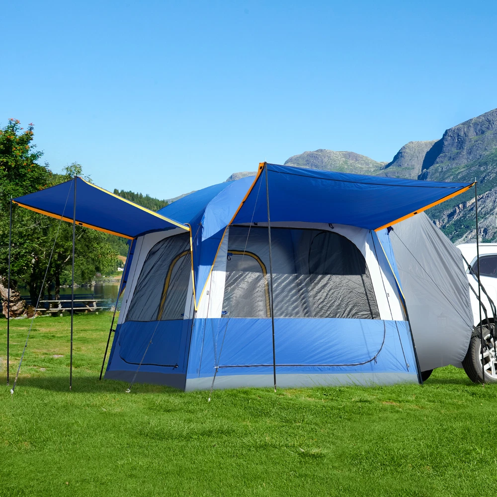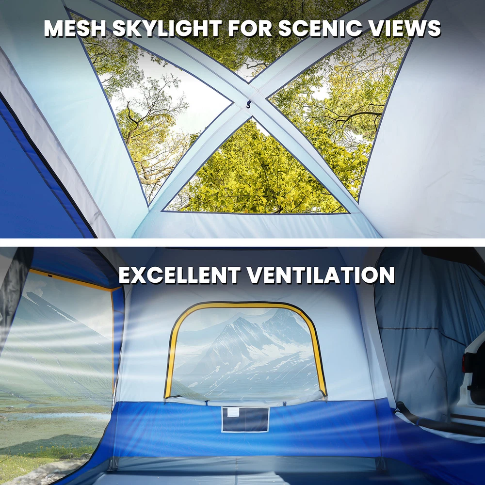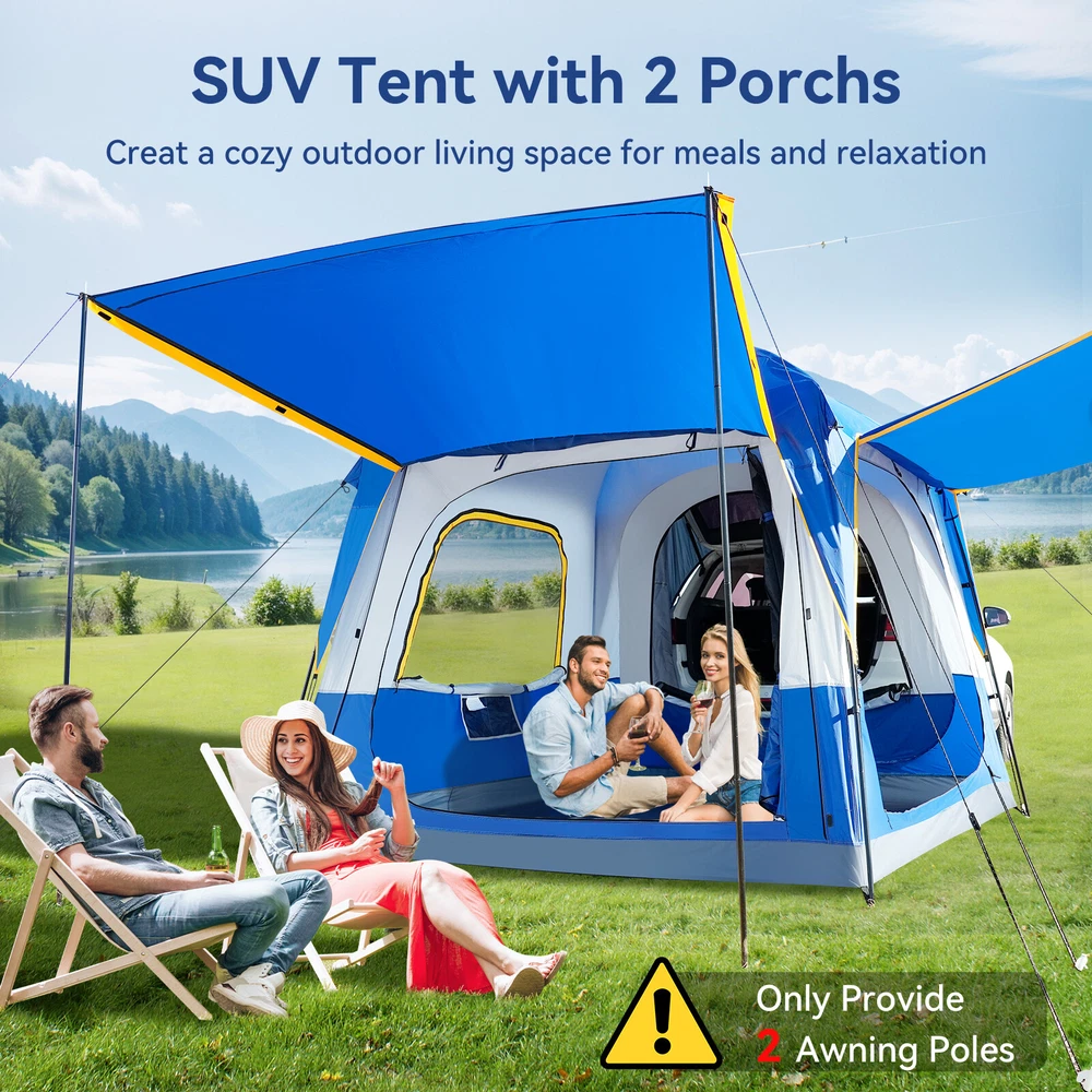 Advanced Weather Protection: Crafted from 150T Oxford fabric with a PU3000mm coating, our SUV tent can avoid rainwater infiltration , keeping you dry and comfortable during your camping adventures. Ideal for all-season camping, this tent offers reliable protection against unpredictable weather conditions, making it a must-have for outdoor enthusiasts Spacious Interior Design : With dimensions of 98.4 inch x 98.4 inch x 87inch , our SUV tent provides ample room for 4-6 campers, offering a comfortable and cozy space to relax and unwind after a day of outdoor activities. Featuring poles and clear instructions, the tent is easy to set up, even for beginners, ensuring a hassle-free camping experience Optimal Ventilation and Storage: Enjoy excellent airflow and ventilation with large doors, top mesh skylight, and mesh windows, 2 Porchs providing fresh air circulation and minimizing condensation inside the tent. Additionally, the tent includes mesh pocket for convenient storage of essentials, keeping your camping gear organized and within reach,Features full mesh skylight and large mesh windows for 360° airflow, bug-free ventilation, and unobstructed views of the stars at night. Dual Doors with Awning Function & Extra One Pole Set : The dual-door design offers easy access, and includes an extra one pole set to prop up either door, creating an awning or sunshade for added outdoor relaxing space. (Note: This extra pole set is provided as a gift and can be used for either door. Durable Construction: Built to withstand the rigors of outdoor use, our SUV tent features sturdy materials and robust construction, ensuring long-lasting durability and performance. The waterproof PU3000mm coating and taped seams provide added protection against rainwater, while the high-quality fabric resists wear and tear for years of reliable use Versatile All-Season Use: Whether you're camping in the heat of summer or braving the chill of winter, our SUV tent is designed to excel in all seasons. Its durable construction and superior weather resistance make it the perfect choice for any outdoor adventure, ensuring comfort and protection no matter the weather conditions Adjustable Connection, Fits Most SUVs & Trucks: Our tailgate tent features an adjustable rear connection with elastic bands and a drawstring design, fitting most cars with a rear circumference up to 250 inches. Compatible with popular models like Toyota Highlander/Sequoia, Honda CR-V, Ford Explorer, Jeep Grand Cherokee, Tesla Model Y and more.
