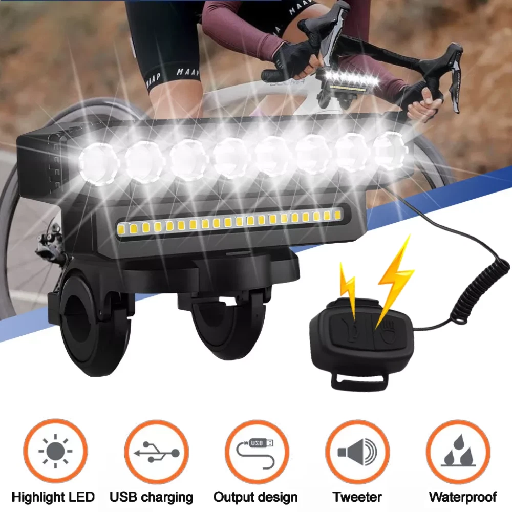Features: 【Super Bright】 【Charging Input and Output】 【Multiple Modes】 【Waterproof and Durable】 【Power Display】 Specification: Beads: 8LED+20SMD Material: ABS Modes: 6 modes (8LED+20SMD full bright-8LED strong light-8LED weak light-8LED breathing light-20SMD strong light-8LED+20SMD burst flash) Charging mode: USB charging Battery capacity: 4000 mAh Waterproof: IP44 Speaker: 130db Product size: 138*40*51mm Package Included: 1 x Bicycle light 1 x Horn Waterproof Super Bright LED Bike Light USB Rechargeable Bicycle Front Headlight Features: 【Super Bright】Bike lights is very bright with the maximum output is 9500 lumens, the 8 led and 20 smd lights cover a wide range up to 800m,bike headlight allows you to ride at night to see wider and further areas, also makes your night riding safer. 【Charging Input and Output】In addition to the normal usb input rechargeable function,this bike headlight also has a USB output function.Bike light has a power bank function that can charge your phone.This is a very important when you are riding outdoors. 【Multiple Modes】6 lighting modes, which can adapt to different scenes. Besides being used as a bicycle light, you can also use it for camping, fishing, night work and activities,bike lights for night riding has a high decibel speaker, and equipped with a wired button switch, making your operation more convenient and safe 【Waterproof and Durable】Bike headlight made from high-quality materials, the bike lights are designed to withstand bike、bicycle、 riding、mountain cycling accessories,bike headlight with IP44 waterproof ratings, bicycle lights front and rear can handle rain, snow, and other outdoor elements. 【Power Display】The rechargeable high powered led bike lights for night riding comes with battery level display,bicycle light shows the battery level and charging status,allowing you to monitor the power status at all times. Specification: Beads: 8LED+20SMD Material: ABS Modes: 6 modes (8LED+20SMD full bright-8LED strong light-8LED weak light-8LED breathing light-20SMD strong light-8LED+20SMD burst flash) Charging mode: USB charging Battery capacity: 4000 mAh Waterproof: IP44 Speaker: 130db Product size: 138*40*51mm Package Included: 1 x Bicycle light 1 x Horn Payment Shipping Return Contact us About us Payment 1.Paypal, Credit Card, G Pay etc, many payment way is accepted. 2.Please be sure your shipping address is correct before make a payment. Shipping 1.We are shipping from multiple warehouses (Houston, Texas/ Corona, California) , please note before placing an order 2.We will ship out the item within 1-3 business days after comfirming the payment, appreciate your patience. 3.If the items are broken on the way( we will check the orders clearly before we sent them ),please contact us in 3 days you received it. We will send you a new one or refund your payment. Return 1.We stand behind every buyer.Items can be returned for exchange or refund within 30 days. 2.Please contact us when you have any confusion of our item, we will solve the trouble for you as soon as possible. Contact us 1.This is professional Seller.We will reply your message within 24 hours. 2.Please contact us whenever you have any question about the item. We will deal with it as soon as possible. 3. If you are unhappy with the item or our service,please Contact Us before leave feedback,just give me a chance,thank you! About us 1. Unless specified otherwise, all our products are IN STOCK and are shipped from Local warehouse - Not Overseas! 2. We provide a 30 day Satisfaction Guarantee or your money back (provided items are in the same new and resaleable condition.) 3. We have a PayPal Verified Business Account, please buy with Confidence! 4. Every item will be tesrted before send.We know our products well and if we don't have the answers we will do our best to find them for you! 5. Our friendly team look forward to serving you! Your satisfaction is our No.1 Priority We will do our best to satisfacy you.