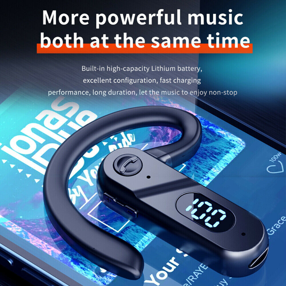 Product Description Features: True wireless headset with Bluetooth 5.2 chip, faster transmission and more stable signal. Bone conduction concept design with high definition LED power display. With intelligent noise reduction technology, you can enjoy HiFi sound effect music or have HD phone talking even in a noisy environment. Ergonomic design with silicone gel earhook, it won't fall off easily and more comfortable without earplugs. Low power consumption, long battery life, long standby time is available after fully charged. The headset could be used to answer/reject calling, skip/play/pause songs, and activate voice assistant, such as for Siri and for android voice assistant. With intelligent voice reminder, helping you to know the real-time status of your headset. IPX grade waterproof level, no need to worry about getting wet by rain and sweat. Best companion for safe driving, fitnexx exercise, courier delivery, business office, etc. Fully compatibility with for iPhone 13 Pro Max/13 Pro/13/13 Mini/12 Pro Max/12 Pro/12/12 Mini/X/XS/XS Max/XR/8/8 Plus/7/6, for Samsung Galaxy S22/S21/S20/S10/S10 Plus/Note 20/Note 10 and other Bluetooth electronic devices. Specifications: Bluetooth Version: Bluetooth 5.2 Transmission Distance: 10meters Bluetooth Protocol: HFP/HSP/A2DP/AVRCP Waterproof Level: IPX5 Earbuds Battery Capacity: 130mAh Charging Time: About 1-2 hours Playtime: About 15 hours Function: Music play/pause, call answering noise reduction, for IOS power display, voice prompt. Color: Black Package Includes: 1 x Bluetooth Headset 1 x Charging Cable 1 x User Manual If you have any doubts or uncertainty about this item, contact us with no hesitation, we are always here and will solve your problems. Thanks and wish you a nice day! About Us We dedicated to provide excellent products and services for all customers on ebay. hope we all can have a nice experiences on eBay. Payment We accept all verified payment through PAYPAL payment. Shipping Usually, Item will be shipped within 1-2 working day after full payment is received. Normally, you will receive the item in 5-7 days. Please contact us if you don’t receive the items after 10 working days after the payment If you have any questions about shipping, please feel free to contact us. Returns Always believe we can solve problems by communication if it comes to any problems about products or any others. If it comes to a return, the products must be intact and as original when you received, and should be within 30 days after you received it. Contact Us Work time: 9:00 AM to 18:00 PM Beijing Time You can contact us at anytime you want, we will reply all messages at the first time. powered by