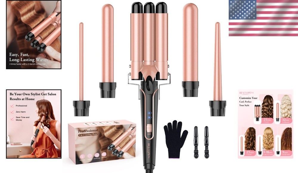 Waver Curling Iron Wand 5-in-1 Set with 3 Barrels for Women All Hair Types ‹ › ‹ › ‹ › ‹ › ‹ › ‹ › ‹ › ‹ › ‹ › ‹ › ‹ › Waver Curling Iron Wand 5-in-1 Set -Includes 3 Barrels for Women, Suitable for All Hair Types Features: 3 extra-long barrels designed for even and fast heating of longer hair lengths. Create 5 types of gorgeous curls to effortlessly switch up your looks. 30 seconds instant heat up for quick, salon-grade curls at home. Adjustable heat setting with 2 temperature options suitable for all hair types. Releases negative ions to reduce frizz and flyaways, leaving your hair shiny and healthy. Supports dual voltage (100V-240V), perfect for travel. Includes 1 glove and 2 hair clips for added convenience and value. Benefits: Make stunning beach waves and curls faster and easier. Customizable styling options for versatile looks every day. Achieve beautiful results while saving time and money with salon-quality styling at home. Protects your hair with adjustable heat settings, suitable for all hair types. Perfect for on-the-go styling with travel-friendly design. Why Choose Our Waver Curling Iron Set? Transform your styling routine with our Waver Curling Iron Wand 5-in-1 Set, designed to create stunning, salon-quality curls in the comfort of your home. With the convenience of three interchangeable barrels, you'll have the versatility to express your beauty and style daily. The adjustable heat settings ensure your hair remains healthy and gorgeous, while the rapid heat-up feature saves you precious time. This set is not only a luxurious addition to your beauty arsenal, but it also offers excellent value with thoughtful inclusions such as a protective glove and styling clips. Elevate your hair game and indulge in gorgeous, defined curls that last all day. Order your Waver Curling Iron Wand Set now and experience the epitome of at-home hairstyling! Shipping Free & Fast Shipping - We offer free shipping to most of the USA with a normal delivery time of 3-7 days. However, due to the current situation, additional delivery time (up to 3 weeks) may be required for some items. Alternative Carriers - We may use alternative carriers (e.g. USPS, FedEx, UPS, etc.) to ensure your package arrives safely and on time. Due to the use of multiple carriers, we are unable to provide a tracking number automatically. Handling Time - Orders are processed and shipped within 1-2 business days of receiving cleared payment. Shipping Restrictions - Shipping to Alaska, Hawaii, Puerto Rico, Guam, and other US territories may incur shipping charges or delivery restrictions. Please contact us before ordering, or your order can be refunded/cancelled. State Restrictions - There may be restrictions based on your state of purchase. For example, certain items may not be shipped to California due to state regulations. Contact for Tracking Updates - If you require tracking updates or have any concerns about the delivery of your order, please feel free to contact us, and we will be happy to assist you. Return 30-Day Hassle-Free Returns - We want you to be completely satisfied with your purchase. If you are not, you can return the item within 30 days of receiving it for a full refund or exchange. Easy Return Process - To start a return, simply contact us and we will provide you with a prepaid return shipping label and detailed instructions. Restocking Fee - There are no restocking fees for returns. However, the buyer is responsible for return shipping costs if the return is not due to a seller's error. Refund Processing Time - Refunds will be processed within 5 business days of receiving the returned item in its condition. Payment We accept all major credit cards, PayPal, and Apple Pay for your convenience. Your payment information is secure and encrypted to ensure a safe and seamless transaction. Please complete your payment within 3 days of purchase to avoid any delays in shipping. Feedback Your feedback is extremely important to us. We strive to provide the best products and customer service possible. If you are satisfied with your purchase, please take a moment to leave us a positive review. If you have any concerns or issues with your order, please contact us before leaving negative feedback. We are committed to resolving any problems and ensuring your satisfaction. Contact Us If you have any questions or concerns, please feel free to out to our customer support team. You can contact us through the eBay messaging system. We are available Monday to Friday, 9:00 am to 5:00 pm EST, and we will do our best to respond to your inquiry within 24 hours. Buy it now and enjoy a pleasant shopping experience! Unit Quantity: 2 lb Barrel Size: 1.25 in,0.35 in Features: Adjustable Heat Settings,Dual Voltage,Instant Heat,Interchangeable Barrels Power Source: Electric Power: 250W Hair Type: All Hair Types Material: Ceramic Type: Waver Curling Iron Heating Plate Material: Ceramic Maximum Temperature: 450 °F Size: Standard Size Number of Temperature Settings: 2 Color: Rose Gold