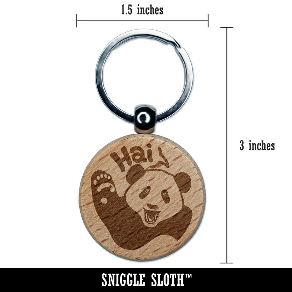 Waving Panda Saying Hai Engraved Wood Round Keychain Tag Charm