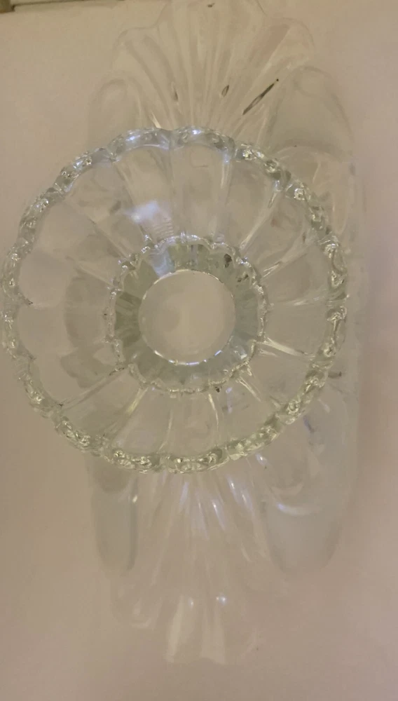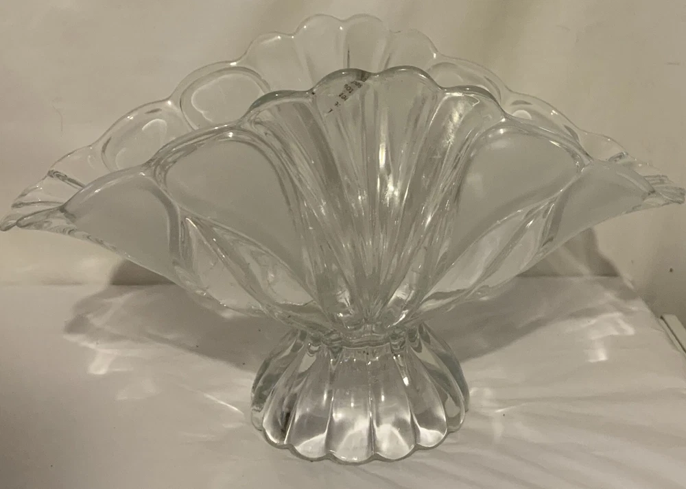 The product is a wavy frosted and clear lead crystal fan-shaped fruit bowl, measuring 7.5 inches high. Made of lead crystal, this bowl features a unique fan shape with frosted detailing that adds a touch of elegance to any dining or kitchen setting. Its clear color enhances the beauty of fruits or decorative items displayed within, making it a stylish and functional addition to any home decor. Perfect for serving fruits or as a decorative piece, this bowl is a versatile and eye-catching option for any kitchen or dining room.