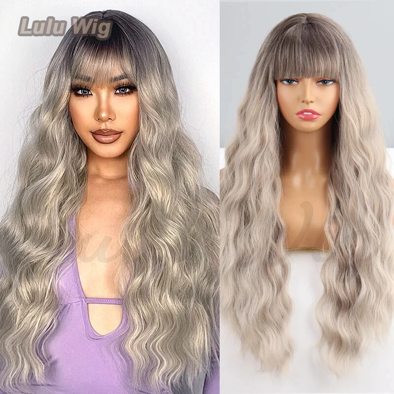 Wavy Long Ombre Grey Blonde Synthetic Curly Cosplay Wig with Bangs
