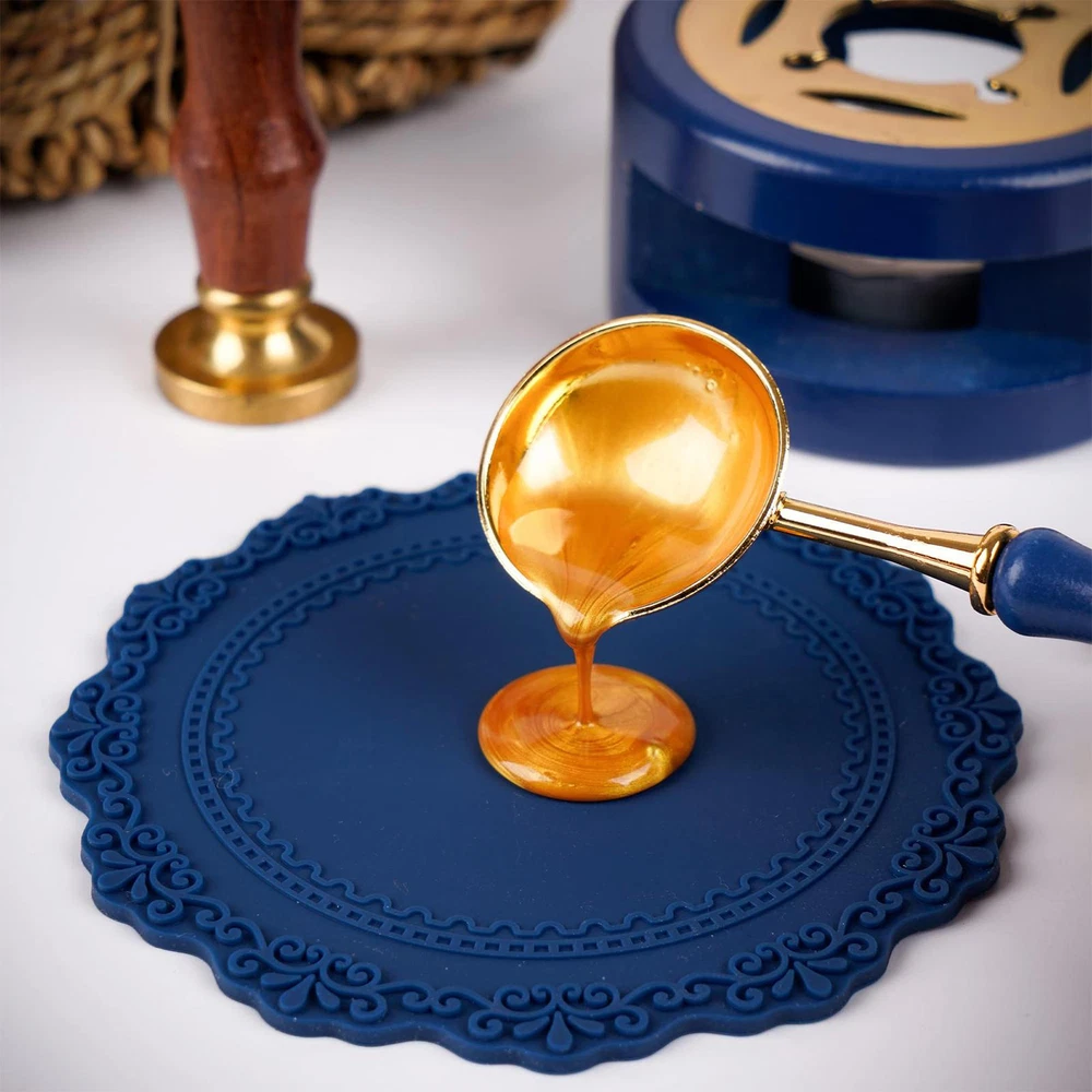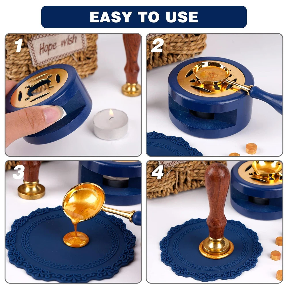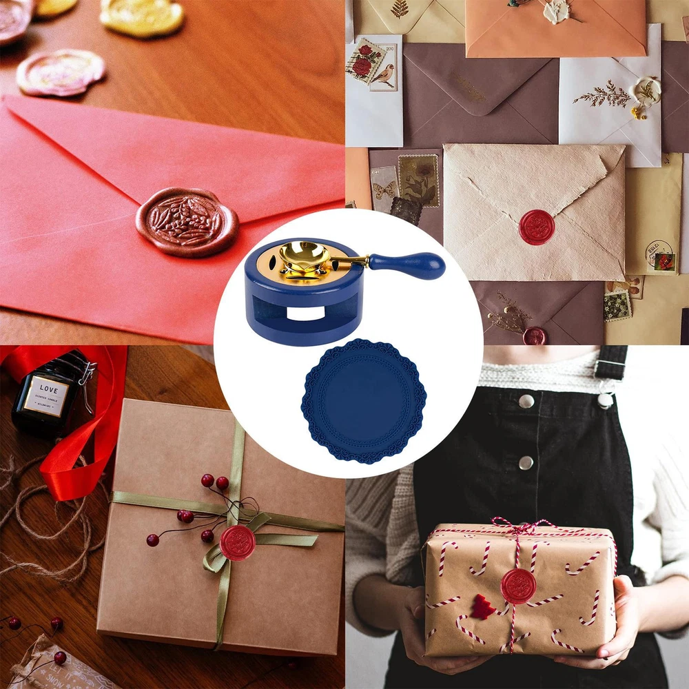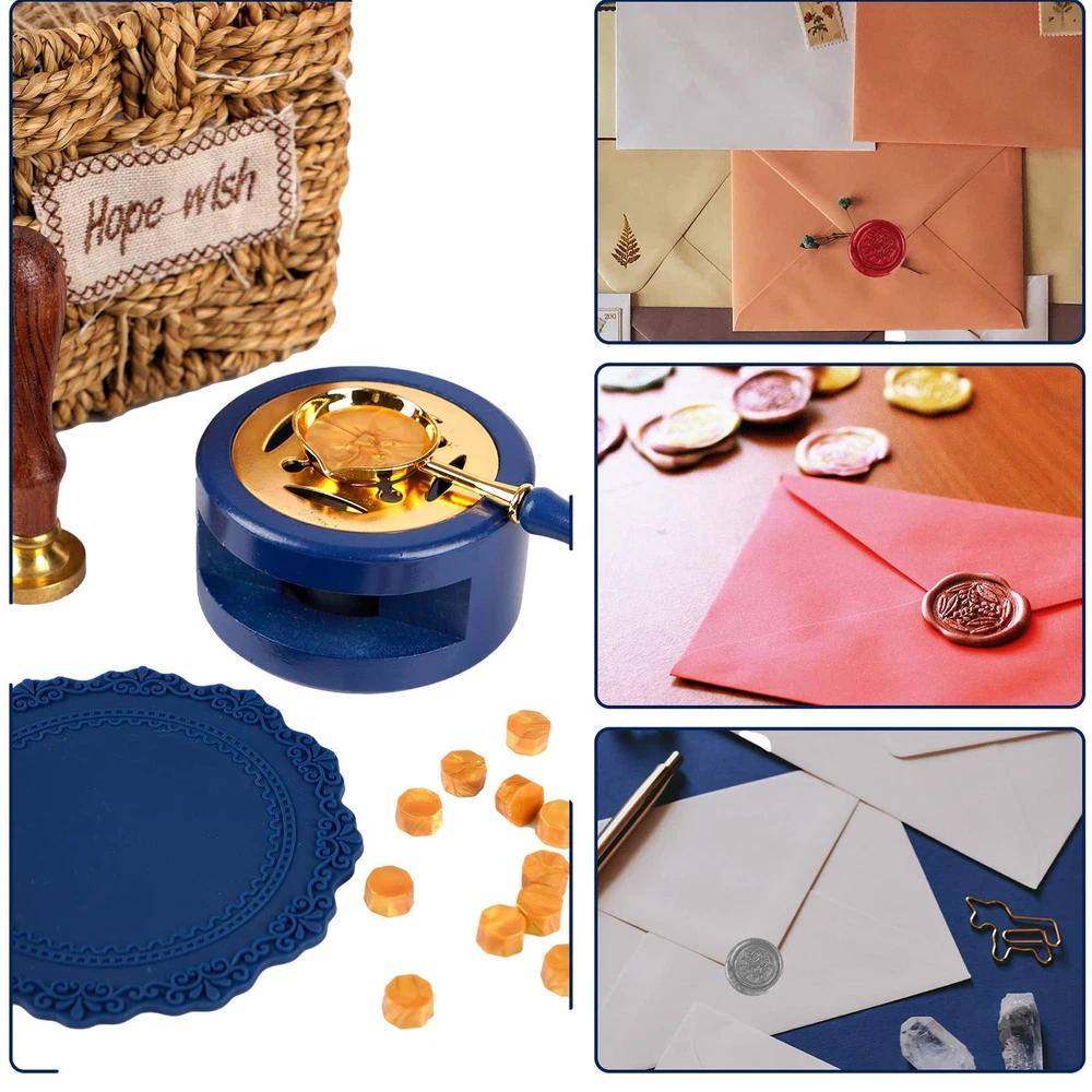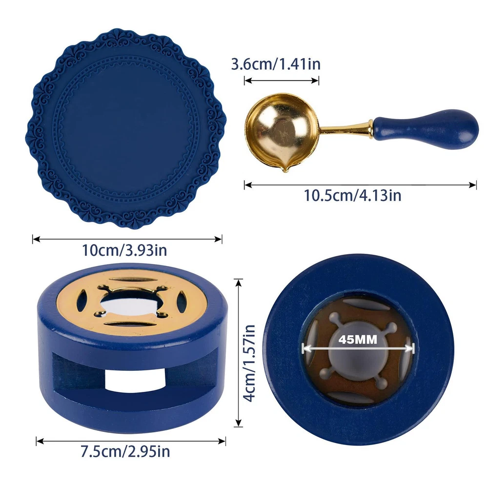 【Retro & Elegance】The wooden part of our Wax Seal Melting Furnace is painted with beautiful blue glaze, combining retro, nobility, elegance, beauty, and practicality. 【Safe & Durable】Our Wax Seal Heater is made of high-quality wood and metal, the wax stamp spoon is made of metal and heat-insulating wood, the wax stamp pad is made of high-quality silicone, which will not burn your fingers, is safer and more durable. 【Easy to Use】The spoon of our Wax Melting Stove for melting enough wax to make a perfect stamp. A pouring mouth is convenient for pouring the wax onto where you want to get stamps. Great for first-timers or experienced, easy to use. 【Wide Application】Our Wax Seal Warmer helps to melt wax seal beads or sticks quickly and release your hands to make preparation before wax seal stamping, such as folding invitations & envelopes. 【Valuable Gift】Our Wax Seal Melting Pot is suitable for wax seal lovers and beginners, Great value for Christmas, mother's Day, Father's Day, and Halloween gift sets. Descriptions: 1. The wax seal melter is made of high-quality wood and metal, the wax seal spoon is made of metal and heat-insulating wood, and the wax seal pad is made of high-quality silicone, which will not burn your fingers, safer and more durable. 2. Put the lighted tea light into the wax seal heater, please use a tea light shorter than the wax seal heater (1-2 cm tea light is recommended), put wax seal beads or wax sticks in the wax seal spoon, heating. Melt the wax on the stove and pour it over envelopes, invitations, or whatever you want to stamp. Take out the stamp and wait for it to cool, a beautiful stamp is finished. 3. The wooden part is painted with beautiful blue glaze, combining retro, noble, elegant, beautiful, and practical. 4. Great for making envelopes, invitations, vintage letters, wine packaging, scrapbooking, craft gifts, or other gift boxes. Specifications: Material: wood+metal+silicone Size: Wax seal heater is 7.5cm/2.95in in diameter and 4cm/1.57in in height The length of the melting spoon is 10.5in/4.13in Silicone pad diameter is 10cm/3.94in Style: as picture shown Packing list: Wax seal heater*1 Melting Spoon*1 Silicone pad*1