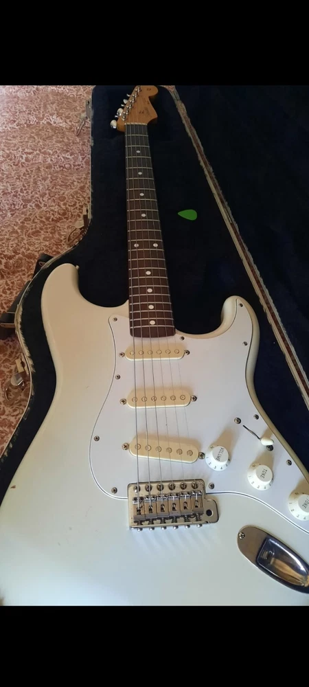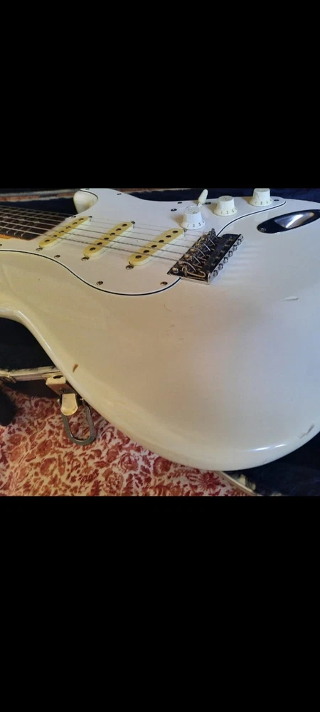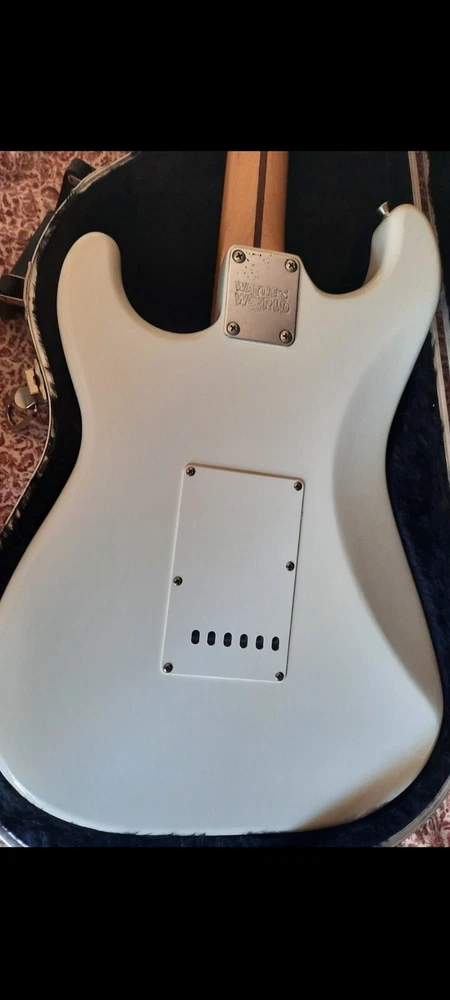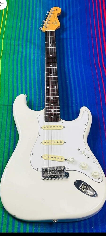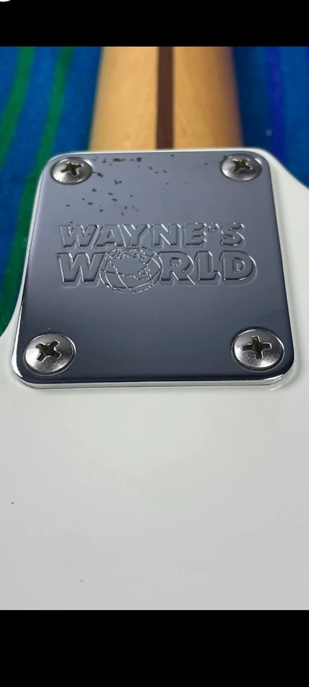 The "Wayne's World Fender Squier 92-93" is a professional-level electric guitar with a solid white body. This 6-string guitar is a model from 1993 and was manufactured in Japan. It features a right-handed configuration and is a part of the Fender Squier brand. The guitar is likely a limited edition model inspired by the movie "Wayne's World," known for its distinctive design and potentially collectible status. Party on.