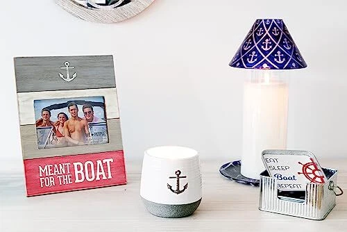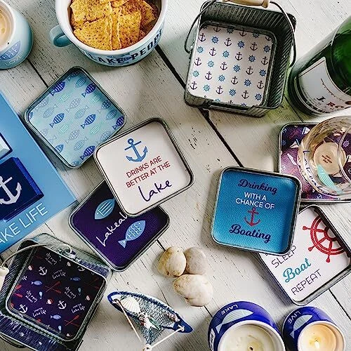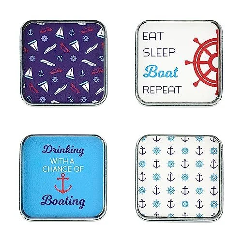 The Boat Set of 4 coasters includes coasters printed with boats, anchors and ship wheels, coaster says "Eat Sleep Boat Repeat," and the fourth coaster says "Drinking with a Chance of Boating." PREMIUM QUALITY: Set of four metal coasters lined with IN-HOUSE DESIGN: Each set of four coasters comes with a handy coaster carrier with a metal handle trimmed with wood for easy handling. Coasters are printed with four different sentiments to match the Livin the Life Boat theme. Notch in the front of the coaster holder makes it easy to remove and replace coasters. PERFECT GIFT: Great gift for the outdoor dad, beach friend , lake lovin, camp life brother or sister and pretty much anyone who enjoys the sun and outdoors! CARE INSTRUCTIONS: Avoid sunlight, wipe with cloth PERFECT GIFT: Great gift for the outdoor dad, beach friend , lake lovin, camp life brother or sister and pretty much anyone who enjoys the sun and outdoors!