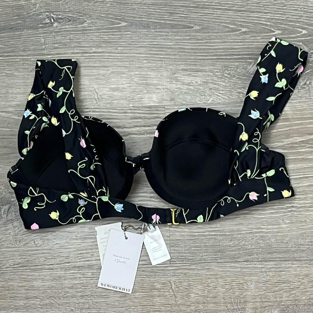 We Wore What Bikini Top XL Underwire Cups, Hook Back, Wide Pleated Shoulder Straps, Black Rose Bud Floral, Lightly Padded, Sweetheart Neckline, Stretch Strap Width 31” Nylon Spandex WeWoreWhat