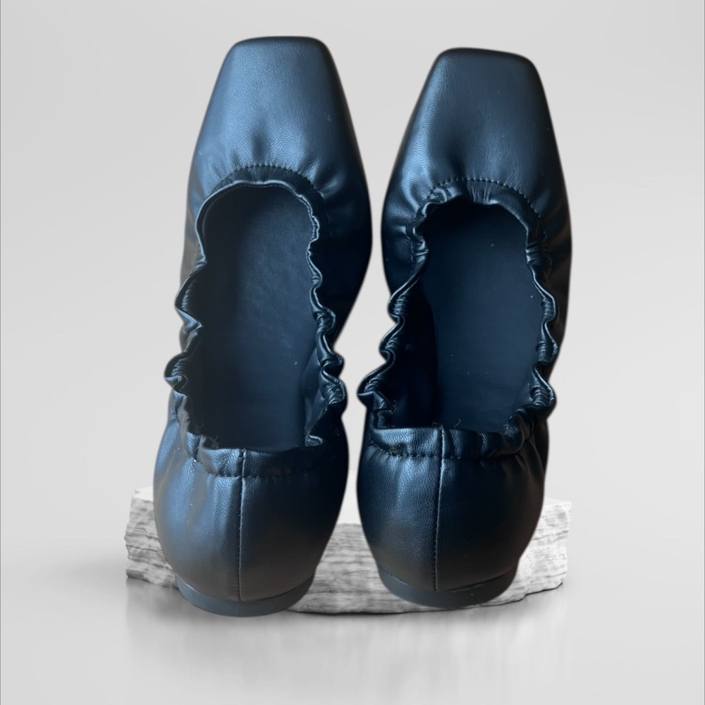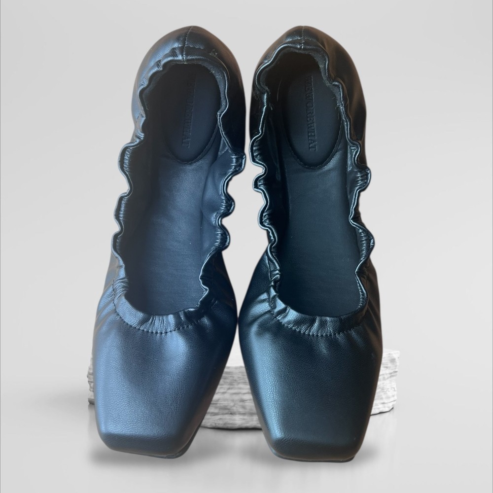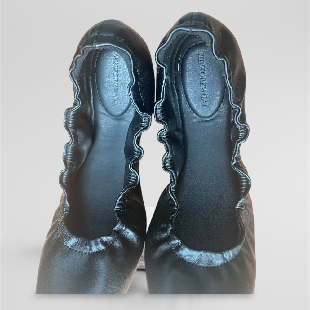 * - Elegant black leather ballet flats with a ruffled edge. Perfect for casual or formal wear. * - Chic black ballet flats by WeWoreWhat in size 38 US 7.5 - 8. * - Premium soft black leather upper with elegant ruffle trim detailing around the topline. * - On-trend square toe silhouette for a modern, sophisticated look. * - Cushioned insole provides all-day comfort. * - Durable rubber sole with textured grip for traction. * - Easy slip-on style. Perfect for the office, weekend errands, or travel. * - Never won - New without Tags - The shoes are in excellent condition. Designer quality at an amazing price!