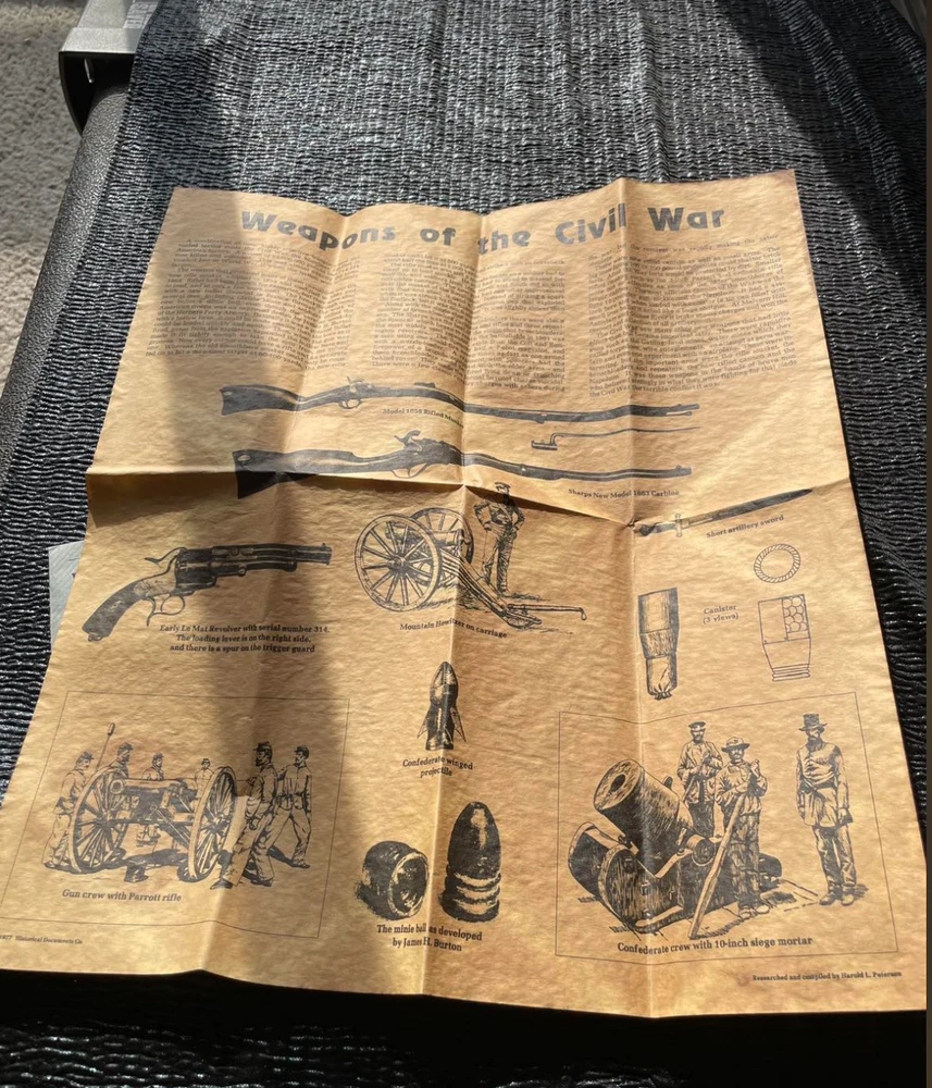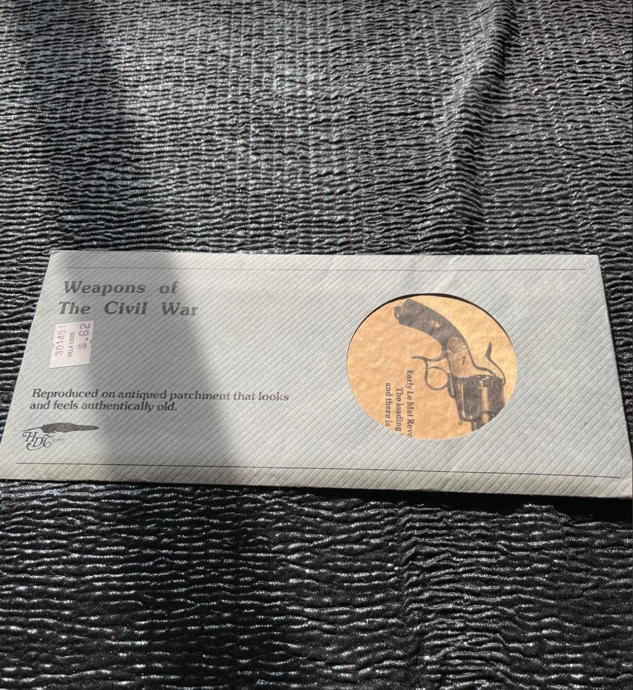 Reproduced on antiqued parchment that looks and feels authentically old. The envelope is blue (I have seen envelopes in other colors.) Old Villa Louis price sticker on face. Shows such weapons as Parrott rifle, Le Mat Revolver, minie balls and more.