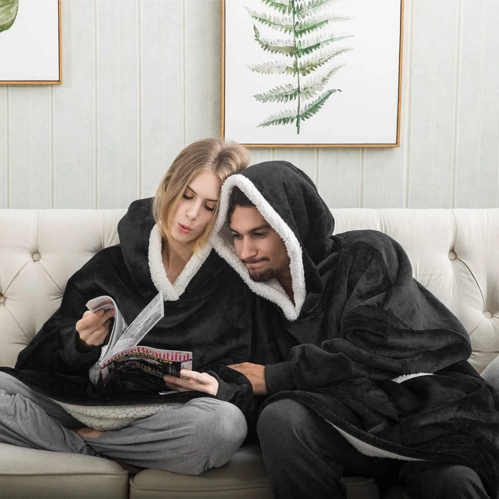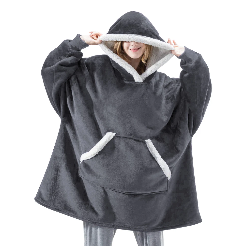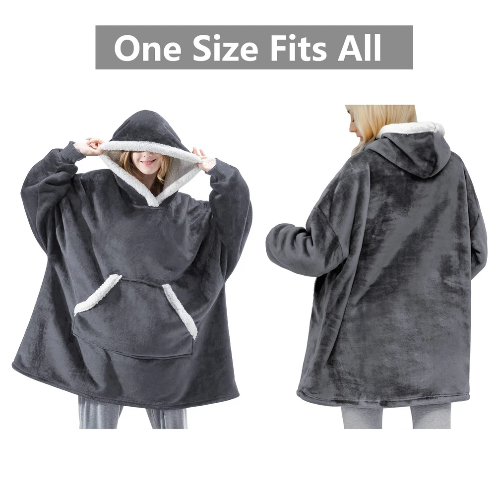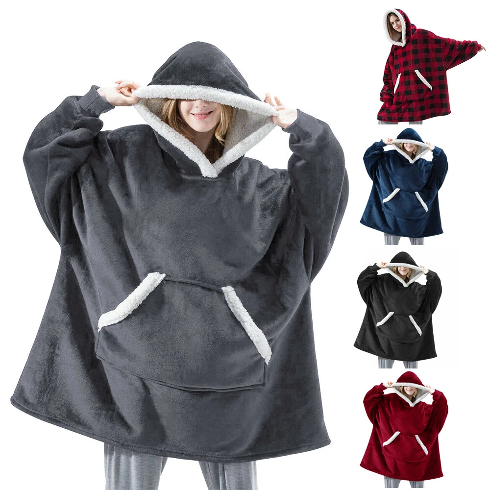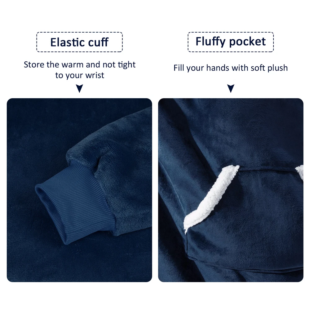 Preface Our wearable blanket combines versatility and comfort into one. You can go anywhere without feeling cold with our blanket hoodie. Blanket sweatshirt moves with you while providing mobility and cover. Features: Double-faced Fabric: Our wearable blanket uses double-faced fabric and provides you different touch feeling. The flannel fleece fabric is smooth and comfy. The sherpa fabric can provide you extremly soft and warm. One Size Fits All: The dimenions of the wearable blanket is 51x63 inches that means very fit to anyone. Adults, teenage boys and girls can wear it easily. Its also great gift idea for your beloved ones. Oversized Hood: The big plush hood can keep your head, ear, neck from feeling cold. The thickened design hood even can be used as a pillow. Elastic Cuffs: Loose sleeves can keep you stretch your arms at will. Tight and elastic cuffs prevent cold air from entering the cuffs. The material in wrists possesses high resilience and fits all, offer extra warmth and comfort, suits for those who have high demand for comfort. Large Pocket Our blanket hoodie is more convenient and practical than traditional hoodie blankets. There is a big pocket to hold remote, phone, snacks and so on. Leaving Your Hands Free. For Home and Outdoor Activities: Our blanket sweatshirt can not only be used at home, but also can provide you with warmth during outdoor activities. You can go out to climb mountains, picnics, and other entertainments with friends and family members. Specification Type: Fleece Sweatshirt Blanket Material: Flannel, Sherpa fabric Color: Royal Blue, Burgundy, Black and Red Plaid Size: One Size :51x63 inches Gender: Unisex Shoulder: 28.3 in / 72 cm Sleeve: 19.2 in / 49 cm Length: 34.6 in / 88 cm Style: Loose and Casual Package Content 1 x Fleece Sweatshirt Blanket