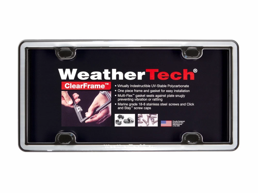 Untitled Document WeatherTech ClearFrame License Plate Frame- Durable Frame - 1 Pack - 17 Colors! The WeatherTech License Plate ClearFrame is a flexible one-piece, virtually indestructible, clear license plate frame designed to prevent moisture and dirt penetration. Please check state and local laws prior to use. ClearFrame Features: Flexible gasket helps prevent moisture and dirt penetration Stepped lip design to fit license plate snugly Click and Stay screw caps Stainless Steel hardware kit included to fit most vehicle applications Virtually indestructible 1 ClearFrame per order Product Description ClearFrame The WeatherTech ClearFrame License Plate Frame has all of the features of the ClearCover in a frame. It is made from virtually indestructible UV-Stable Lupillon 3000. It’s one piece frame and gasket design allows for easy installation. The Multi-Flex Gasket seats against your plate snugly preventing vibration or rattling. Marine grade 18-8 stainless steel screws and Click and Stay screw caps are included. WeatherTech ClearFrame has many styles to choose from, and will compliment any vehicle. Shipping Please allow up to 10 business days for delivery. The majority of our products are packaged and shipped within only one business day, however some orders may take up to six business days for delivery. Please choose the 2nd day or Overnight option if you need your products faster. Free Shipping applies to the 48 contiguous States only. If you live in Alaska or Hawaii there will be a shipping charge that you can see by entering your zip code in the shipping and handling section under the shipping and payments tab. We have the rates posted for all available shipping options. Free Shipping does apply to APO/FPO addresses! Tracking Number and Notification of Shipment. We ship each order with Guaranteed Delivery and tracking. Your tracking number will be uploaded to eBay shortly after your order has been shipped. We do not ship to PO Boxes. Please provide us with a physical address for prompt processing and shipment. Returns What is your return policy? We're happy to accept returns for items in new condition and in the original packaging for any reason. We do not charge any return processing or restocking fees, however all returns must be issued a Return Authorization (RA) number. Please contact us via the eBay message system to receive a RA number. Please note that, unless WeatherTech has made an error, the buyer is responsible for all return shipping charges. Payment What payment types do you accept? We gladly accept all payment types offered by eBay. Feel free to contact our support team via the eBay message system with any questions or concerns. Sales Tax Sales tax is charged in accordance with state and local law. Other WeatherTech products you may be interested in: Cargo Liner Side Window Deflectors TechCare Techshade Looking for more of the world's highest quality automotive accessories? We're proud to offer a full line of custom and universal accessories to protect virtually every part of your vehicle. Take a look at our full lineup and shop for your vehicle in our official ebay store!