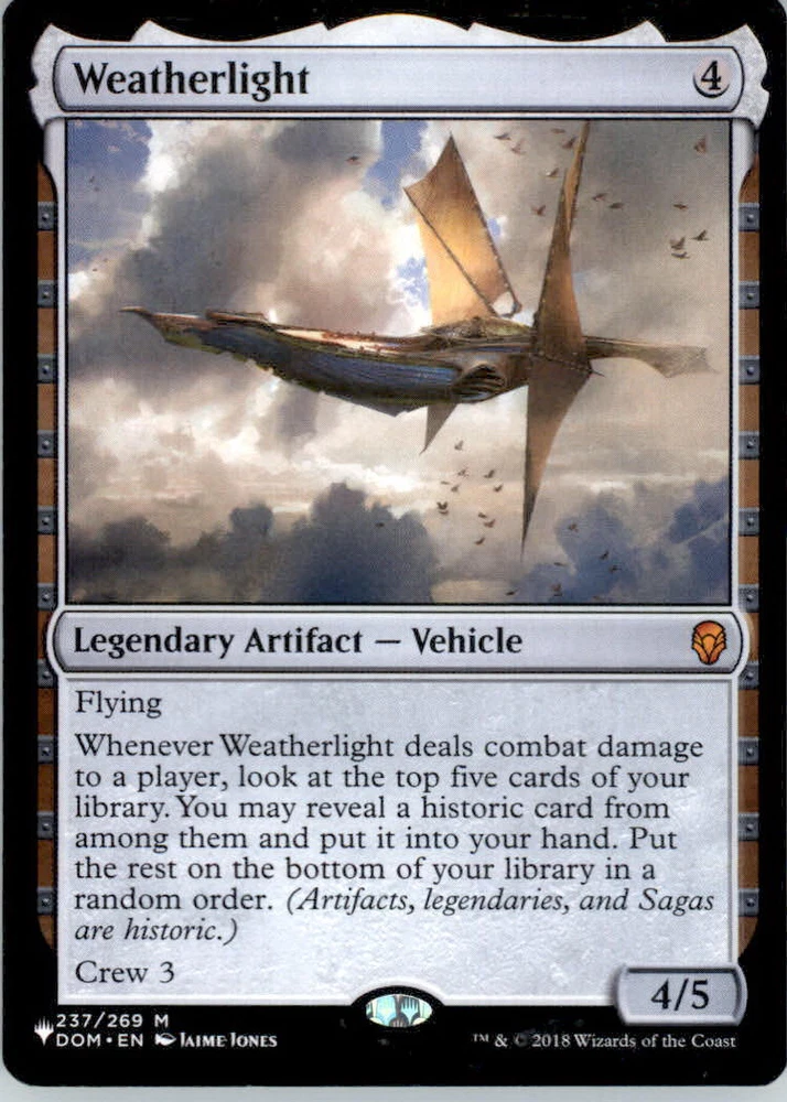Character: Weatherlight Card Number: 237 Features: Mythic Set: The List Reprints Graded: No Game: MAGIC_THE_GATHERING Card Name: Weatherlight Type: Collectible Card Game Rarity: Mythic