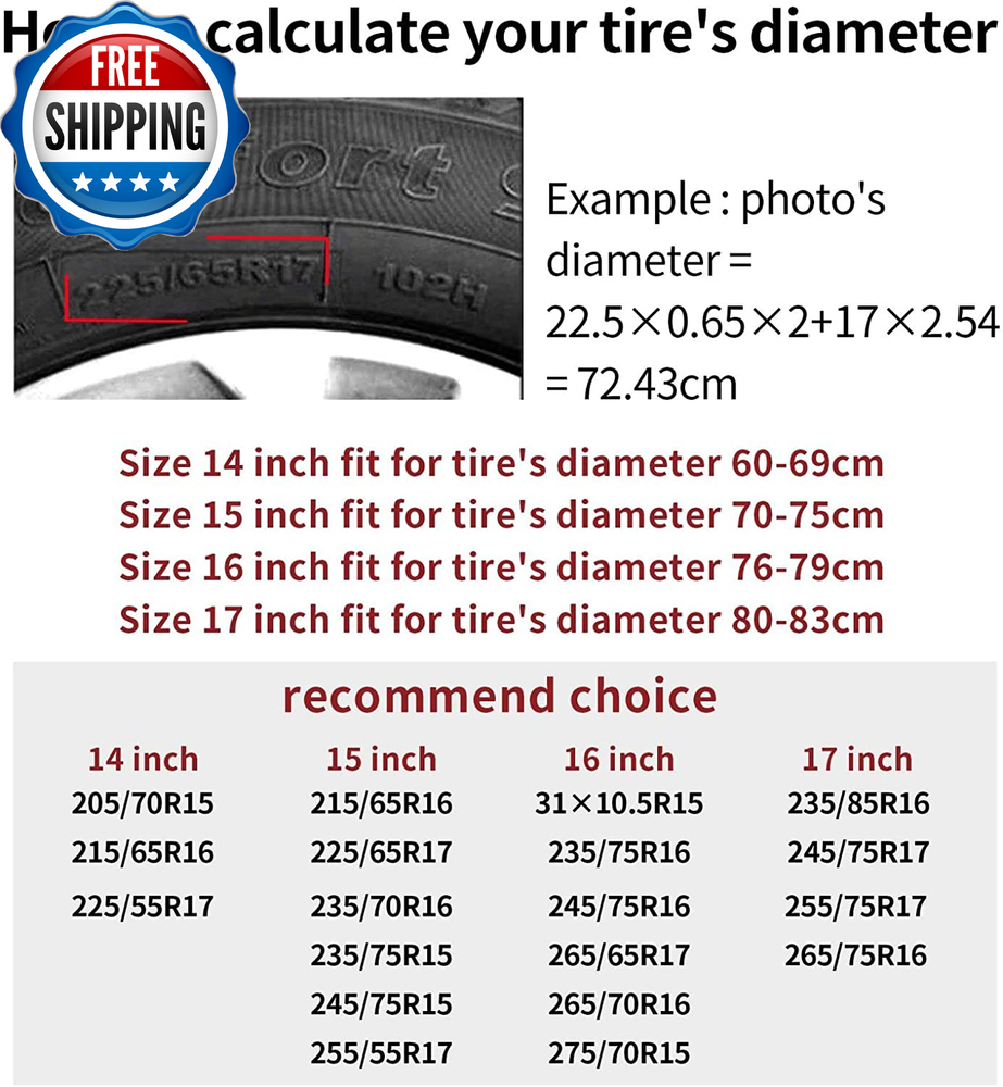Spare Tire Cover Weatherproof Sun Protection Wheel Tire Cover Universal Fit Trailers RV SUV Truck Camper Travel with US American Flag (14" for Tire Diameter 25.59"-27.2"/65-69Cm) Material: This spare tire cover is made of high-quality polyester fiber with good wear resistance dustproof waterproof and sun protection. Personalized Design: Show your love for life while protecting your spare tire. Easy to Install & Application: The tire cover is easy to install and remove without any tools. Tethered design only needs to tie a knot to fix after the installation is completed. Size: Fit For Trailers RV SUV and many vehicles. You can choose the best size for your spare tire. Please check the size of the tire cover carefully before buying so that you can avoid problems caused by choosing the wrong size. Good Service: Any issues with your order please contact us directly and we'll respond within 24 hours. Product Description Add to Cart Add to Cart Add to Cart Add to Cart Add to Cart Customer Reviews 4.4 out of 5 stars 76 4.1 out of 5 stars 11 4.7 out of 5 stars 38 4.1 out of 5 stars 38 4.4 out of 5 stars 53 Price $16.99 $ 16 . 99 $13.99 $ 13 . 99 $14.99 $ 14 . 99 $16.99 $ 16 . 99 $18.99 $ 18 . 99 Water-resistant ✔ ✔ ✔ ✔ ✔ Non-scratch ✔ ✔ ✔ ✔ ✔ Dustproof ✔ ✔ ✔ ✔ ✔ UV-resistant ✔ ✔ ✔ ✔ ✔ Windproof ✔ ✔ ✔ ✔ ✔ Size 14-15-16-17 Inch 14-15-16-17 Inch 14-15-16-17 Inch 14-15-16-17 Inch 14-15-16-17 Inch Shipping Fast shipping is very important for us. Our standard US shipping service is FREE. Your order will be shipped within 2-3 business days upon full payment received. Your order will be delivered within 2-3 business days after the handling time. We only ship to the confirmed PayPal address. We reserve the right to cancel any order for any reason at any time. We are not responsible for undeliverable addresses. Returns and payment We offer a 30 days return policy from checkout winning date. We allow only PayPal as payment method FeedBack Your feedback very important to us, after you get your package and you are satisfied with our service please leave us positive feedback If you have any problem with your order / any questions please before leave any type of feedback For any questions, using eBay contact system Please visit our eBay store to check out other items for sale! Thank you for shopping at our store.