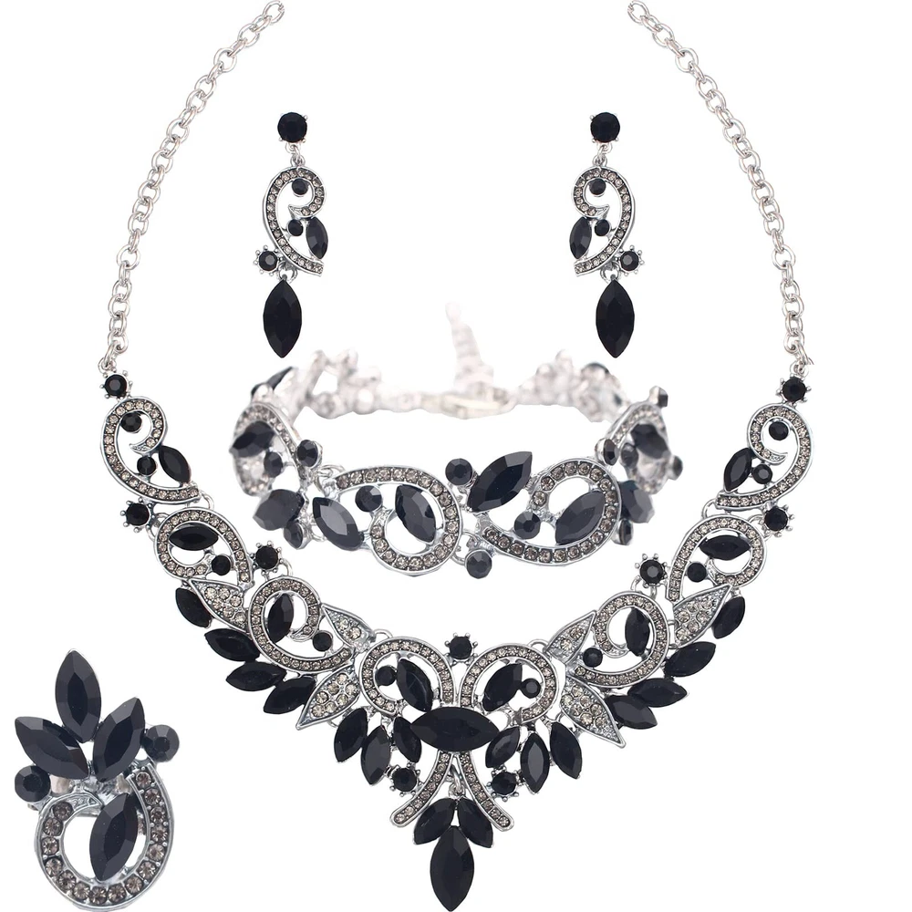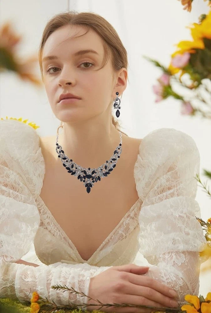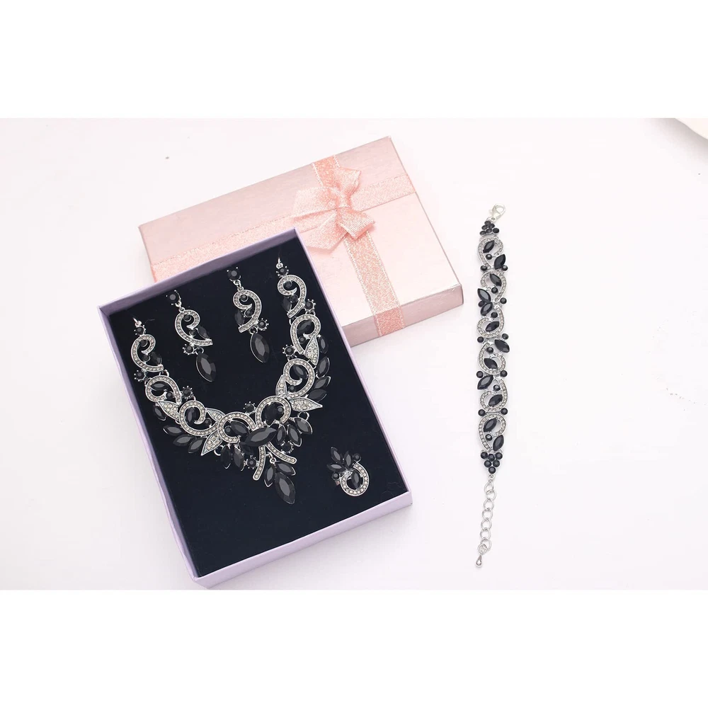 Wedding Bridal Prom Austrian Crystal Rhinestone Statement Necklace Earrings Bracelet Ring Wedding Party Costume Jewelry Sets for Brides Women Product Details Color: Black-Platinum Plated Brand: SFE MPN: Does not apply UPC: Does not apply EAN: Does not apply Department : womens Date First Available : April 15, 2022 Brand, Seller, or Collection Name: SFE Metal: gold plated Material: Metal Gem Type: Crystal Clasp: Lobster Clasp SFE Brands: This Jewelry Sets could be Birthday Gifts, Anniversary Gifts, Christmas Gifts, Graduation Gifts,Valentine's Day Gifts,Bridal Wedding,Bridesmaid,Party,Birthday, Prom,etc. Never outmoded design, elegant and stylish, you will never regret for this choice. The earrings skin test grants allergy free, nickel-free and lead-free, wear it rest assured. About SFE Brands: We have a strong design team, we will launch different styles every season, follow us! We will give you a different surprise. Tips: 1.Wipe your earrings up with wipes: they perform miracles on jewelry. Avoid contact with water, no baths, pools, sea water, etc. If it gets wet that can leave dark water spots which are difficult to remove 2.Then wipe with a clean dry soft cotton cloth to bring back the shine. Please don't wear it when sleeping. To keep your gorgeous jewelry looking like new, take it off at the end of the day and give it a quick wipe down with a microfiber cloth 3.Put it inside a soft cloth pocket or fabric swath, avoid it from rubbing against other jewelry