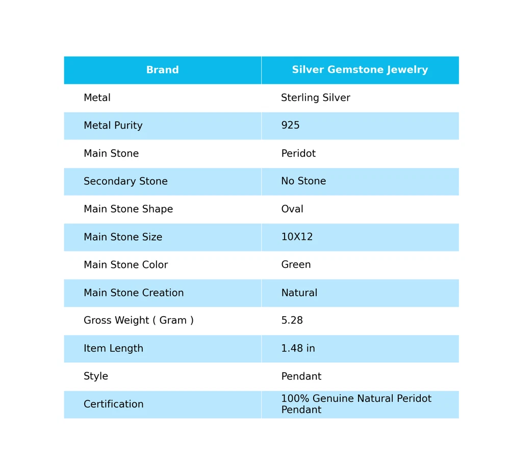 Welcome to Jaipur Silver Gallery Wedding Gift For Her 925 Silver Natural Peridot Gemstone Pendant Handcarfted Handmade Pendant, Sterling Silver Pendant, Peridot Pendant, Handcrafted Pendant SKU : - JSCP-1-18 Gemstone : - Peridot Stone Shape : - Oval Metal : - Sterling Silver Metal Purity : - 925 Pendant Length : 1.48 Inches Pendant Width : Inches _______________________________________________________________________________________ Amazing Properties of Silver ****************************** Tough and Long-lasting: Silver is incredibly strong, built to withstand daily wear and tear as well as tough environmental conditions. Easy to Shape and Design: Silver is like clay for skilled craftsmen, allowing them to create beautiful and intricate designs effortlessly. Great at Conducting Energy: When it comes to heat and electricity, silver is the go-to. It can quickly and efficiently transfer energy, making it ideal for various applications. Keeps Things Clean and Safe: Silver has a natural ability to keep harmful bacteria at bay, making it a reliable choice for promoting cleanliness and well-being. 3 Underrated Benefits Of Silver ****************************** Gorgeous Charm: Silver jewelry shines brightly, enhancing any outfit and fitting everyone's style with ease. Gentle on Skin: Silver is kind to your skin, reducing the chance of allergies and making it a favorite choice for accessories. Healing Vibes: Some believe silver jewelry has a soothing touch, possibly aiding in easing issues like arthritis, anxiety, and the blues. _______________________________________________________________________________________ For Mother's Day Gift For Father's Day Gift For Promise For Valentine' Day For Halloween Party For Christmas Day Gift For New Year Party For Mom For Her _______________________________________________________________________________________ If you need more help or want design tips, just give us a shout! We're lightning-fast in getting back to you. Every single thing we create is made by hand in our special workshop, and we put a whole lot of love and care into every piece. Thank you for stopping by! We're confident you'll have an amazing time shopping with us. We're here to make sure every moment you spend with us is filled with delight and satisfaction. Happy shopping!