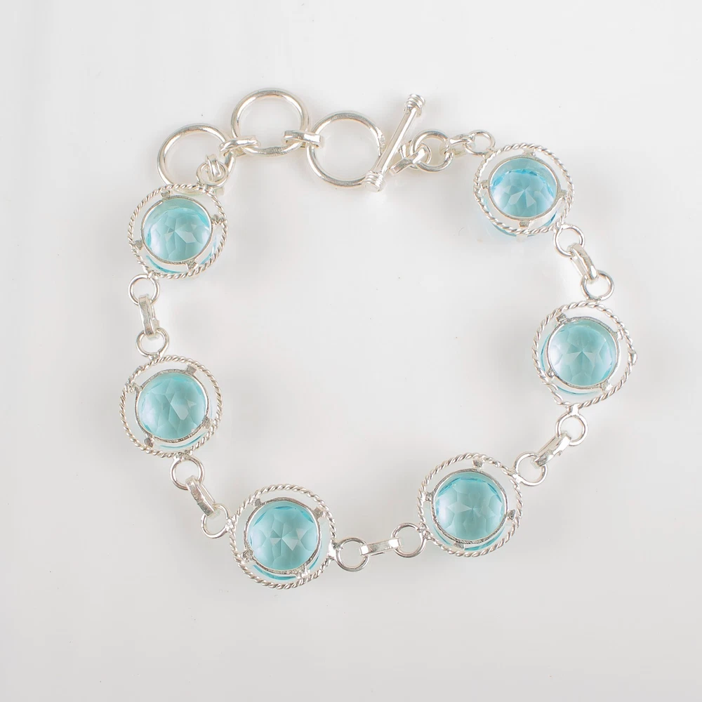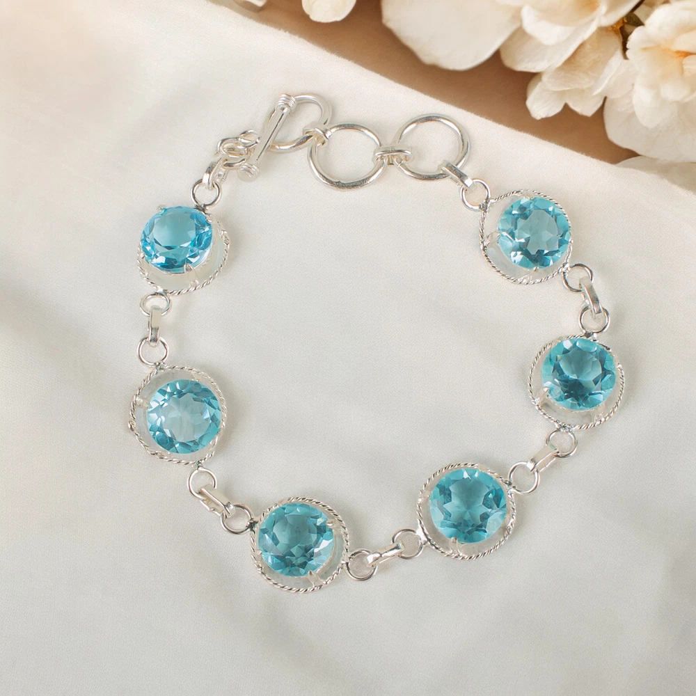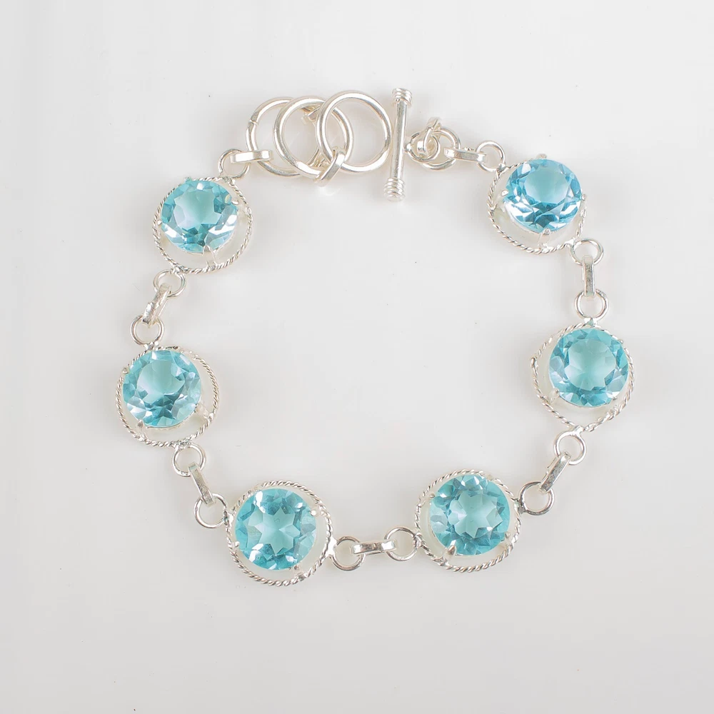 Welcome to Jaipur Silver Gallery Wedding Gift For Her 925 Silver Natural Sky Blue Topaz Gemstone Chain Bracelet Handmade Bracelet, Sterling Silver Bracelet, Sky Blue Topaz Bracelet, Handcrafted Bracelet SKU : - JSRB-1-5 Gemstone : - Sky Blue Topaz Stone Shape : - Round Metal : - Sterling Silver Metal Purity : - 925 Bracelet Length : 7.8 Inches Adjustable : _______________________________________________________________________________________ Amazing Properties of Silver ****************************** Tough and Long-lasting: Silver is incredibly strong, built to withstand daily wear and tear as well as tough environmental conditions. Easy to Shape and Design: Silver is like clay for skilled craftsmen, allowing them to create beautiful and intricate designs effortlessly. Great at Conducting Energy: When it comes to heat and electricity, silver is the go-to. It can quickly and efficiently transfer energy, making it ideal for various applications. Keeps Things Clean and Safe: Silver has a natural ability to keep harmful bacteria at bay, making it a reliable choice for promoting cleanliness and well-being. 3 Underrated Benefits Of Silver ****************************** Gorgeous Charm: Silver jewelry shines brightly, enhancing any outfit and fitting everyone's style with ease. Gentle on Skin: Silver is kind to your skin, reducing the chance of allergies and making it a favorite choice for accessories. Healing Vibes: Some believe silver jewelry has a soothing touch, possibly aiding in easing issues like arthritis, anxiety, and the blues. _______________________________________________________________________________________ For Mother's Day Gift For Father's Day Gift For Promise For Valentine' Day For Halloween Party For Christmas Day Gift For New Year Party For Mom For Her _______________________________________________________________________________________ If you need more help or want design tips, just give us a shout! We're lightning-fast in getting back to you. Every single thing we create is made by hand in our special workshop, and we put a whole lot of love and care into every piece. Thank you for stopping by! We're confident you'll have an amazing time shopping with us. We're here to make sure every moment you spend with us is filled with delight and satisfaction. Happy shopping!