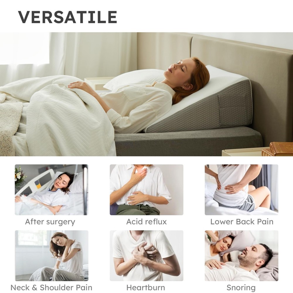 Wedge Pillow for Sleeping, 8 inch Bed Wedge Pillow, Elevated Body Pillow for Back Support, Acid Reflux, Leg, Neck Pain, Snoring, Triangle Pillow Wedge - Cooling Memory Foam Top, Black 2 Layers of Comfort Foam: Our wedge pillow features two layers of premium comfort foam. The top layer consists of gel-infused memory foam, keeping you cool and comfortable throughout the night. And high-density premium foam base offers sturdy support and durability. Breathable & Washable Cover: The pillow's breathable cover allows for optimal airflow, ensuring a cool and comfortable sleep experience. Plus, it's easily removable and machine washable for hassle-free maintenance. 2 Pockets & Portable Design: Our triangle pillow wedge features two built-in pockets, ideal for storing remote controls, phones, or glasses. Additionally, its portable handle allows you to take it with you wherever you go for on-the-go comfort and support. Upgraded & Certified: We've upgraded our foam wedge pillow to ensure the highest quality standards. Standard 100 certified by CertiPUR-US and Oeko-Tex, giving you peace of mind knowing you're purchasing a reliable and trustworthy product.