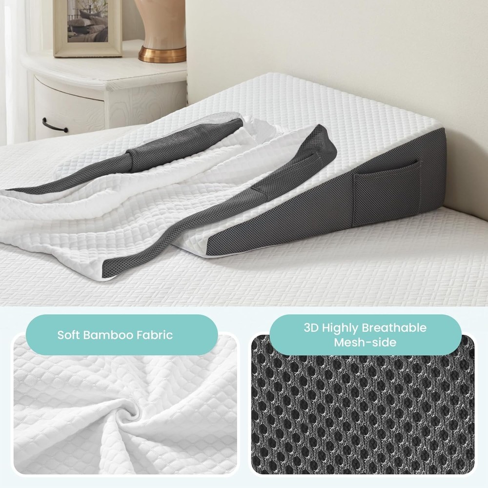Wedge Pillow Cover Fitted 7.5" Bed Wedge 24" W X 24" L X 7.5" H Soft Machine New Pillow Type: Bed Pillow Material: 60% Polyester,40% Viscose fiber from bamboo Size: Cover For White-Grey(24*24*7.5 inch) Product Dimensions: 24"L x 24"W CERTIFIED BY AUTHORITIES: Cozymaker Wedge Pillow is certified by CertiPUR-US and Oeko-Tex Standard 100, proving the quality of the product is guaranteed. Very comfortable bed wedge pillow cover for you and your family to get a good night's sleep! SOFT & BREATHABLE: The Cover surface is made of soft and skin-friendly fabric, which can quickly absorb body heat. The 3D breathable mesh fabric on the side of allows heat to escape and fresh air to circulate in. POCKET DESIGN: It‘s side also features 2 special pockets, easily fit items such as glasses, remote controls or cell phones. MACHINE WASHABLE: The wedge pillow cover are made with high quality zippers, easy to remove and can be used for machine washing. Return Policy: We offer a 30 day return policy from the receiving date. Please contact us for a Free Return Label. Please use our return label so it will go back to our supplier and we can do a refund or replacement afterwards. Feedback: Your satisfaction is very important to us! If you have any problem with your order, please contact us and we will do our very best to make you satisfied. As long as you are happy with your purchase, please leave a positive feedback for us. We will always leave you a positive feedback in return. If you have any problem with your purchase, please do not leave a negative feedback. Please Contact us ... and your issue will be solved quickly and positively We are a small family-owned business trying to make a living, not a huge company that does not care ... We will ALWAYS do our best for you!