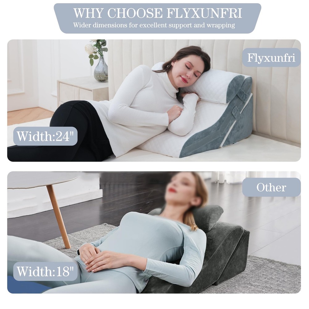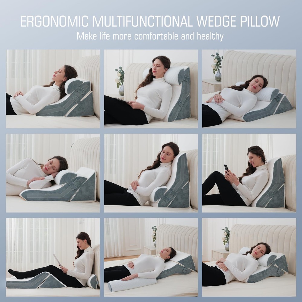 3PCS Bed Wedge Pillows for Sleeping Adjustable Memory Foam Pillow for Acid ADJUSTABLE MAGIC VELCRO - The wedge pillow set is your go-to for comfort and versatile support. Whether you need a cozy prop for watching TV, reading, or relieving body discomfort, this 3PCS adjustable wedge pillow delivers. Offering over 20 configurations, which can be used as head, back, or leg support, adapting to heights (9", 12", 16" or 20") and angles (30°, 45°, or 60°) to fit various sleep positions and relaxation needs. The pillow features lengthened and widened Velcro with an anti-hook design, preventing the material from catching on or damaging the pillowcase. IDEAL COMFORT - Featuring an upgraded 24" width, this pillow wedge is designed to wrap around your body, providing enhanced support and stability. The extra width ensures greater comfort for side sleepers, making it easier to turn over and find your ideal position without slipping off. This spacious design promotes a feeling of being cradled, helping to alleviate muscle tension and improve spinal alignment for a restful sleep or relaxation experience. SAFE CERTIFICATION - This bed pillows & positioners features a 45D high-rebound memory foam half-moon pillow at the headrest for superior contouring and comfort. The memory foam molds to the natural curve of your neck and head, providing tailored support that eases tension. The main body is made of 25D high-density support foam, ensuring firm, stable elevation that resists deformation over time while offering consistent full-body support. Moreover, our wedge pillow meets the highest safety standards, being certified by CertiPUR-US, ISPA, and Standard 100 by Oeko-Tex, making it a healthy choice for your sleeping needs. ERGONOMIC DESIGN - This bed pillow wedge cushion features a professional curved design to support the head, neck, back, waist, legs, and feet. Ideal for post-surgery recovery, it aids with snoring, acid reflux, heartburn, indigestion, nasal congestion, and more. Perfect for reading, watching TV, working, or relaxing, it promotes better sleep, reduces discomfort, and enhances overall health by providing targeted support for various conditions, including post-operative swelling and high eye pressure. EASY TO CARE - The diamond check pattern adds a beautiful, stylish touch that complements your décor, while the invisible zipper design provides a sleek, seamless look. The wedge pillow set features a removable, washable cover for hassle-free cleaning. For convenience, please close the Velcro before removing the cover, making it easier to take it off. The durable, high-quality materials maintain their shape and comfort even after multiple washes, ensuring long-lasting use. WARM TIPS - The wedge pillows are vacuum-packed for efficient transportation. We recommend placing the wedge pillow in a well-ventilated area for 24-72 hours upon receipt to allow it to naturally expand to its original shape, ensuring optimal performance. Always allow the pillow to fully dry before use to preserve its shape and support. Avoid exposing to direct sunlight for prolonged periods to maintain the fabric’s quality.