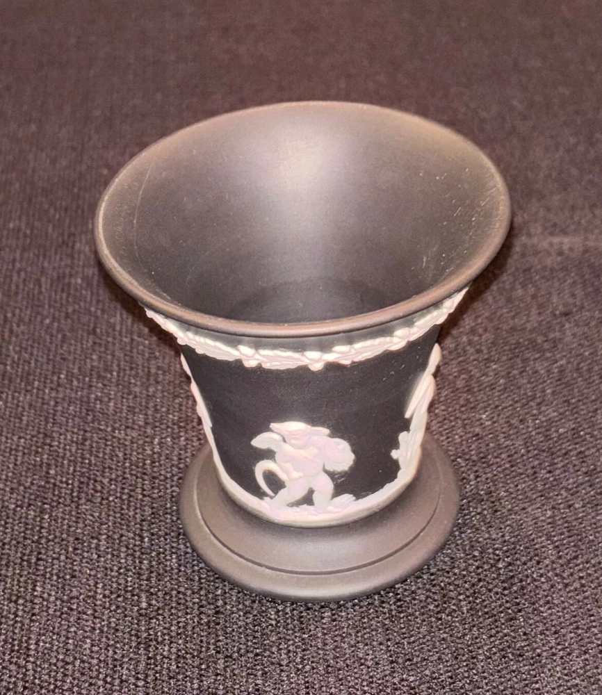 Wedgwood Black Basalt Jasperware Vase Cup Tumbler Cigarette Holder, Made in England. About 3 1/4" high x 3 1/4" wide, nice condition, no chips or cracks. 100% of sales benefit charity, thank you for supporting our cause!