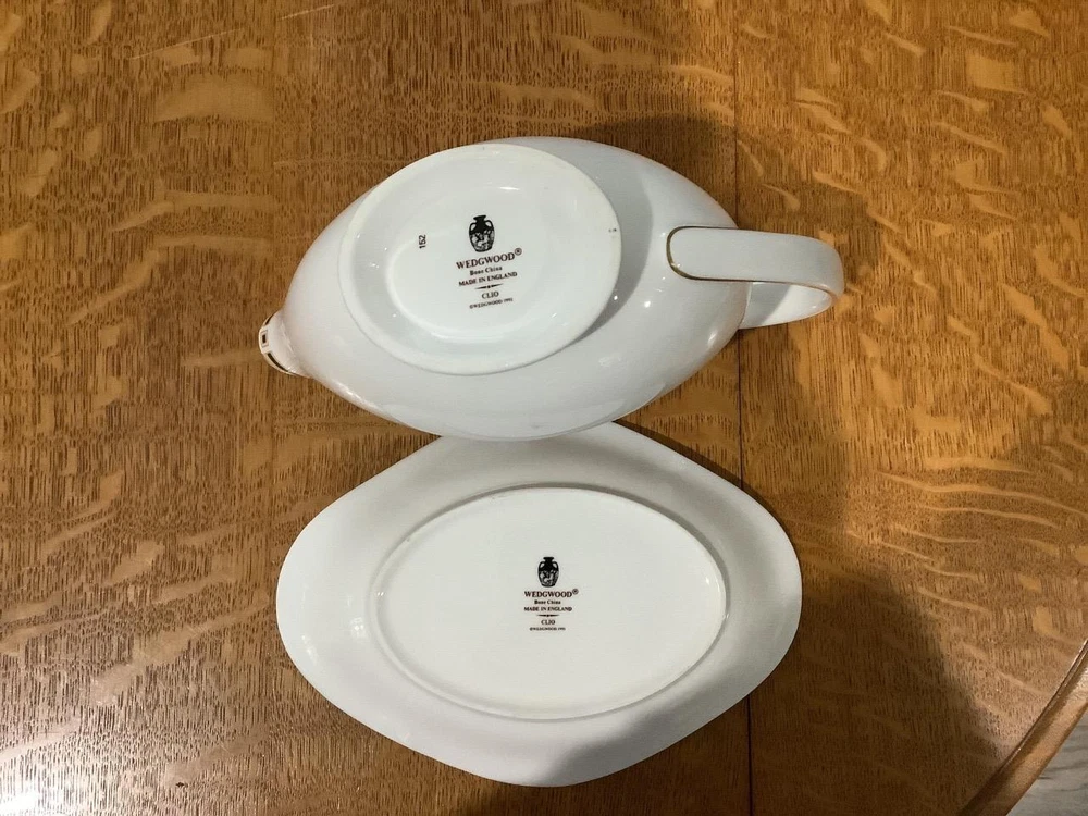 Wedgwood Clio bone china gravy boat and underplate ca. 1991 Wedgwood Clio bone china gravy boat and underplate ca. 1991 Click images to enlarge Description PLEASE NOTE: ALL SHIPPING COSTS ARE ESTIMATES ONLY! THERE ARE TOO MANY VARIABLES FOR ME TO BE ACCURATE EVERY TIME, ESPECIALLY SINCE MANY OF MY LISTINGS GO OUT OF THE COUNTRY. PLEASE DO NOT PAY UNTIL I EMAIL YOU AN INVOICE AT THE END OF THE LISTING! THANKS FOR YOUR COOPERATION. This is a Wedgwood bone china gravy boat and underplate in the Clio pattern. It has a black Portland vase mark. It measures about 8 1/2" long. The underplate is 5 3/4" x 7 3/4". It is in excellent condition with no chips, cracks or wear. Be sure to see my other listings for other pieces in this pattern, including place settings. Be sure to add me to your favorites list ! Get images that make Supersized seem small. Showcase your items with Auctiva's Listing Templates! THE simple solution for eBay sellers. Track Page Views With Auctiva's Counter