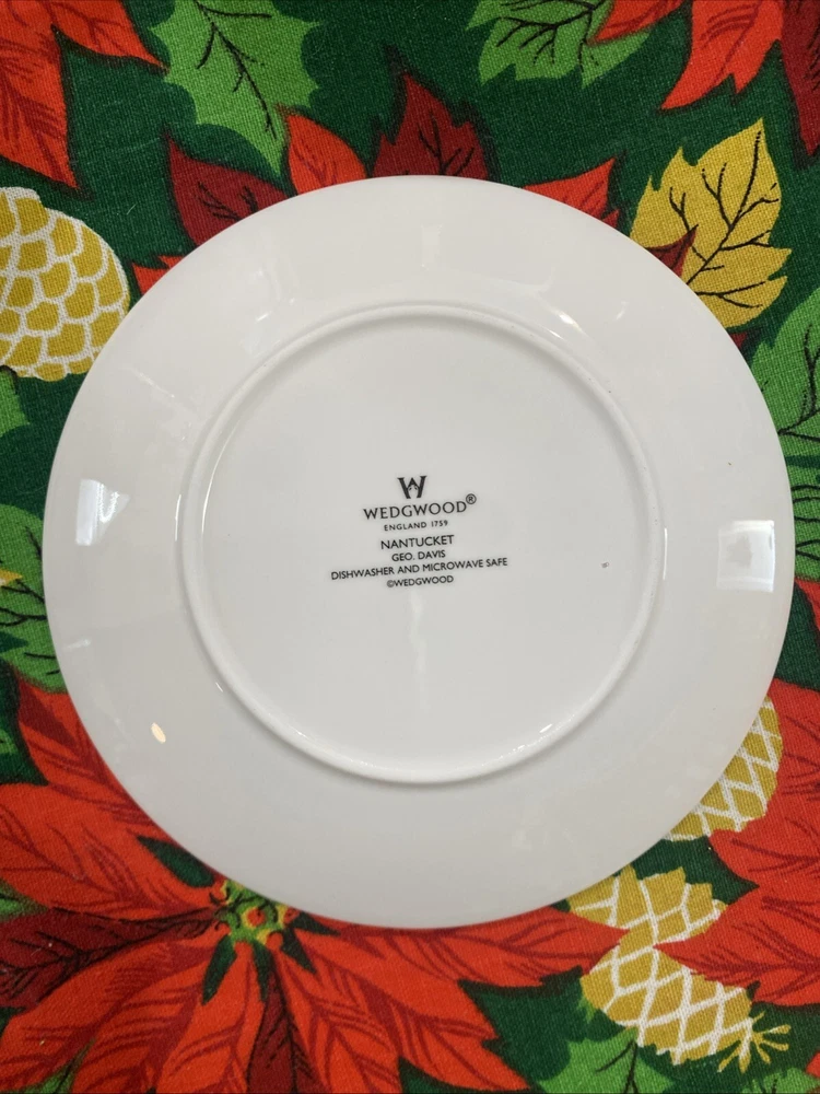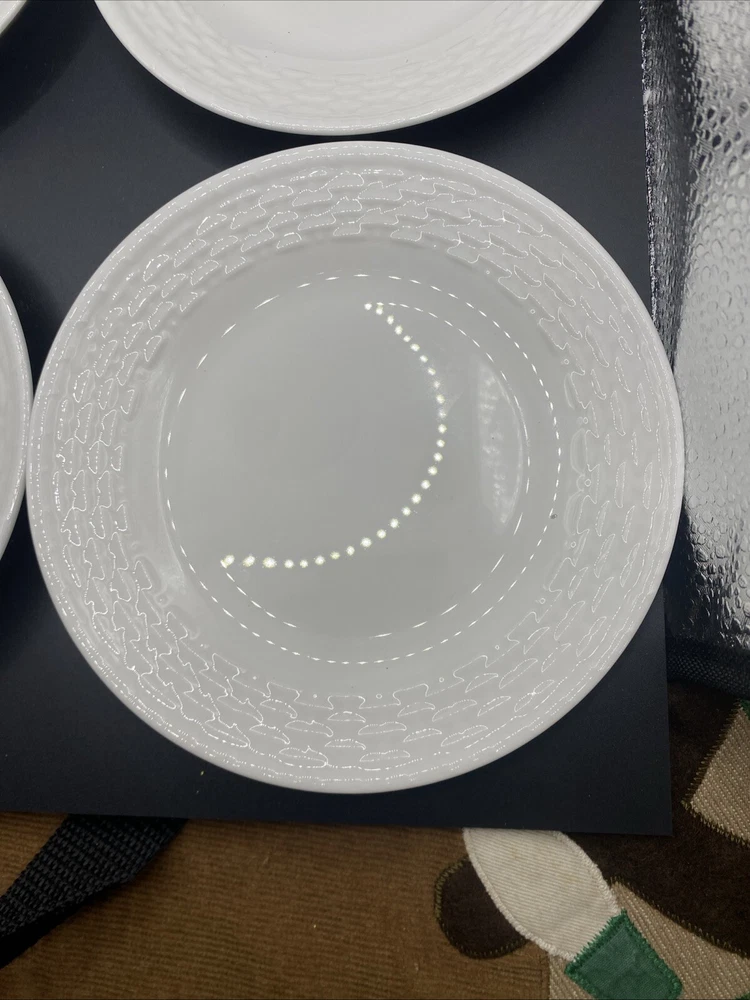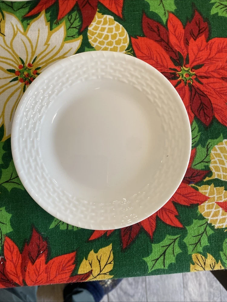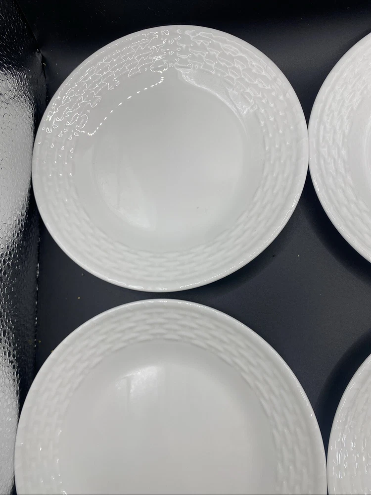 Add a touch of elegance to your dining table with this set of four Wedgwood Nantucket basket weave bread and butter plates. These plates measure 6 inches in length and width and feature a beautiful white bone china material with a painted backstamp. The plates are dishwasher safe, making them perfect for use on any occasion. The round shape and basket theme of these plates make them a great addition to any decorative cookware, dinnerware, or serveware collection. They were manufactured in England in 1986 and are an original Wedgwood product. This set includes four bread and butter plates and is perfect for all occasions.