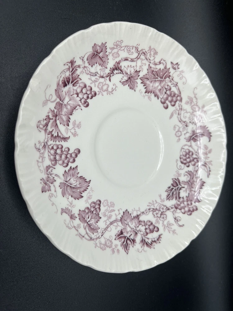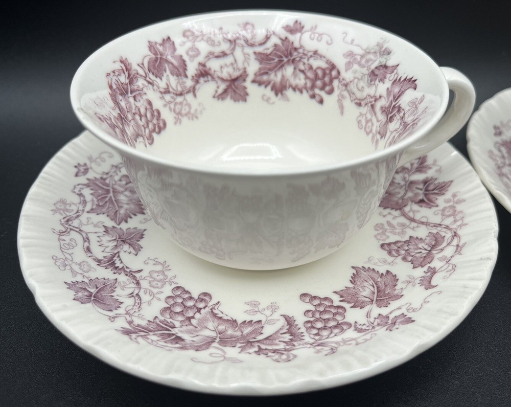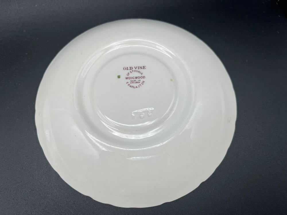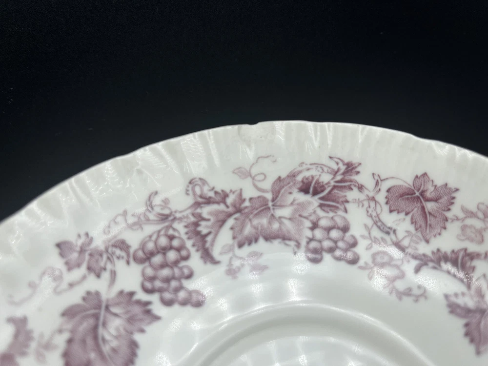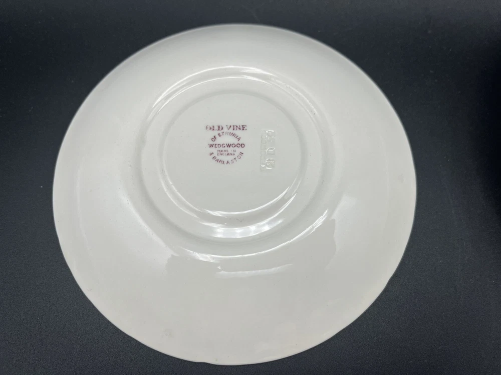 This beautiful tea cup and saucer set from Wedgwood's Old Vine collection is a must-have for any vintage china enthusiast. The intricate purple transferware design on the bone china material is sure to impress. The set includes a cup and saucer, both of which feature the Old Vine pattern. Crafted in England in 1950, this original set is a rare find and is perfect for all occasions. The production technique of pottery and the printed backstamp add to the unique value of this piece. Add a touch of sophistication to your tea time with this stunning Wedgwood tea cup and saucer set. One cup and one saucer have chipping as shown.
