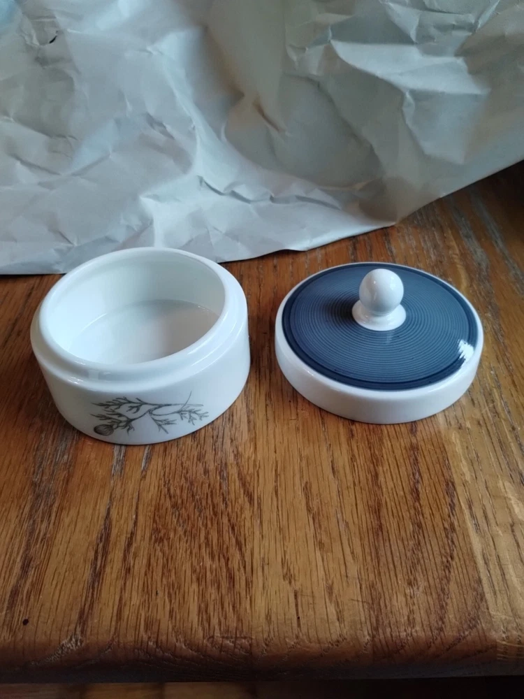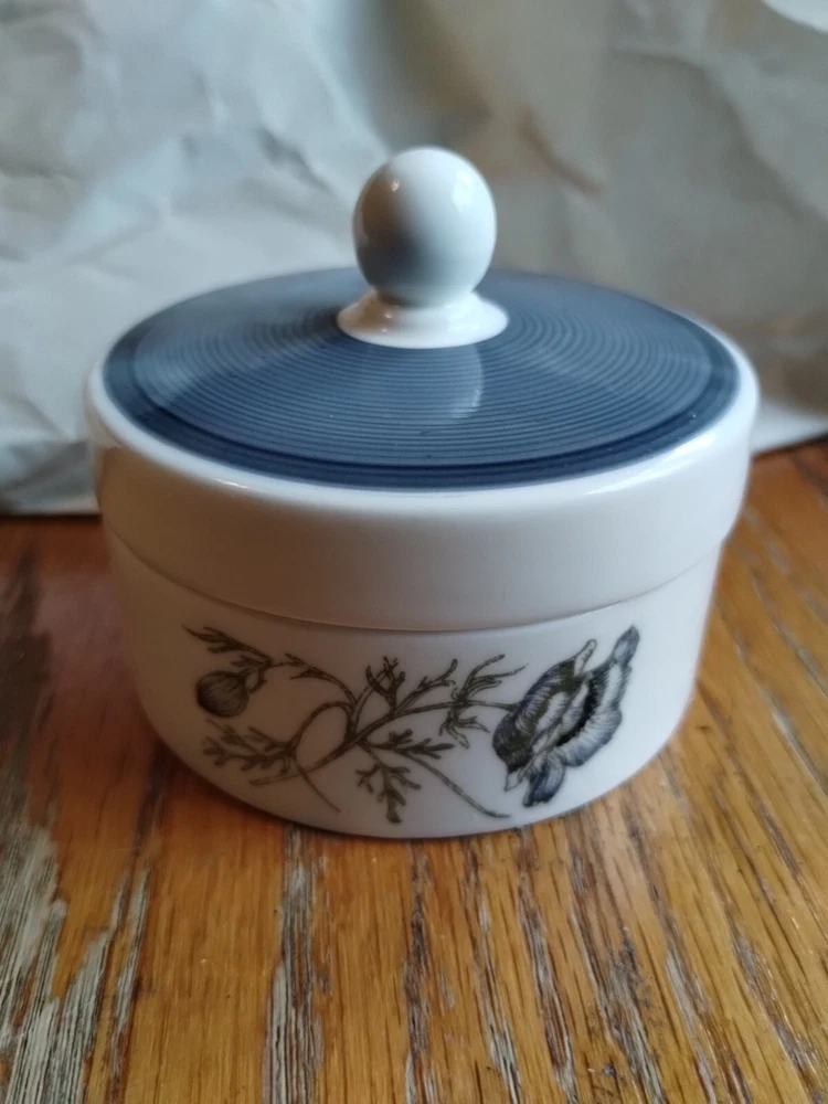 This rare Wedgwood Glen Mist bone china trinket dish is a stunning piece designed by Susie Cooper. Made in England, it features a beautiful multi-color design that is sure to add a touch of elegance to any collection. The dish is made of high-quality bone china and is perfect for storing small items or serving as a decorative piece. It is a must-have for any collector of decorative collectibles and is sure to be a conversation starter. Don't miss out on the opportunity to own this unique and beautiful piece!