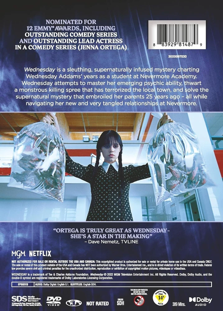 Further Details Title: Wednesday: The Complete First Season (DVD) Condition: New Format: DVD Description: Wednesday is a sleuthing, supernaturally infused mystery charting Wednesday Addams’ years as a student at Nevermore Academy. Wednesday's attempts to master her emerging psychic ability, thwart a monstrous killing spree that has terrorized the local town, and solve the supernatural mystery that embroiled her parents 25 years ago — all while navigating her new and very tangled relationships at Nevermore. Actor: Jenna Ortega Genre: Comedy Rating: Unrated No Of Discs: 1 Run Time: 6 hours Country/Region of Manufacture: USA Studio: Studio Distribution Services Language: English Subtitle Language: English EAN: 0883929814671 Region Code: DVD: 1 (US, Canada...) Missing Information? Please contact us if any details are missing and where possible we will add the information to our listing.
