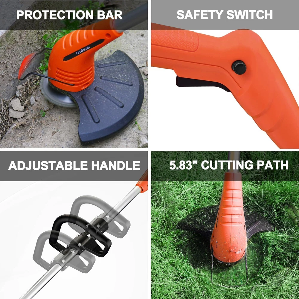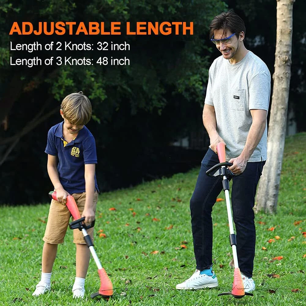 ✅Finest Brand After-Sales Service: We support 1-year machine to ensure you have the best experience, just buy with confidence. If you have any issues when using the electric weed trimmer, please us, we will give you a satisfactory solution. ✅Lightweight, Low Noise & Easy to use: weed wacker weighs only 3.7lbs, making it carry anywhere. Grass trimmer cordless is easy to operate, length and handle can be adjusted, women and the elderly can easily use this grass cutter for weeding work. You can enjoy patio mowing time! ✅3-in-1 Multifunctional Blades: Circular saw blade for pruning thicker shrubs and branches. Metal blades for cutting thick weeds and small shrubs. Plastic blades for mowing soft grass. Cordless weed trimmer is perfect weeding tool for yard, garden, walkways and patios. ✅High-Efficiency Battery Powered: This electric grass mower include 2.0Ah battery and fast charger that can provide super use life, so you can trim more weeds in yard. Quieter, safer, more environmentally friendly and portable than gas or corded string trimmer, you can saves resources and money. ✅Safety Design & More Reliable: Our cordless grass edger has passed the professional design and safety test. Double-switch safety lock function, which can effectively avoid the danger caused by accidental activation. The anti-collision metal pole can protection flowers or ornamental plants while weeding. ✅Excellent Helper for Garden Care: This power lawn trimmer is equipped with a high-performance motor, max speed 10,000rpm. Metal blades can cover 99% of usage scenarios, it will save you 30% of work time and energy, you can weed the garden more easily. ✅Note: Fully charged the battery before the first usage to provide better user experience. Children under the age of 16 are not allowed to use metal blades. Please make sure to tighten the nuts holding the blade and install the entire machine correctly before starting the trimmer. The safety lock can be released after the machine is running.
