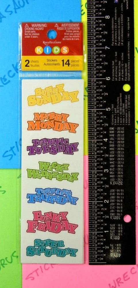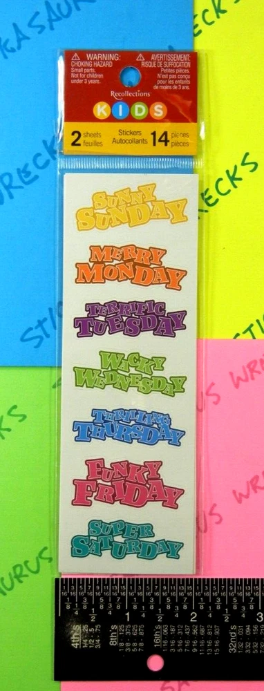 Sticker Pack Is New. Sticker Pack Contains 2 Sheets. Sticker Brand Is Recollection Kids. Sticker Theme Is Weekday Words. When Purchasing Multiple Sticker Sheets Or Packs Please Add All Items To Cart Before Purchase So That Your Purchase Combines Down To Base Shipping Price. Stickers Are Shipped WITHOUT Tracking In An Envelope With Cardstock.