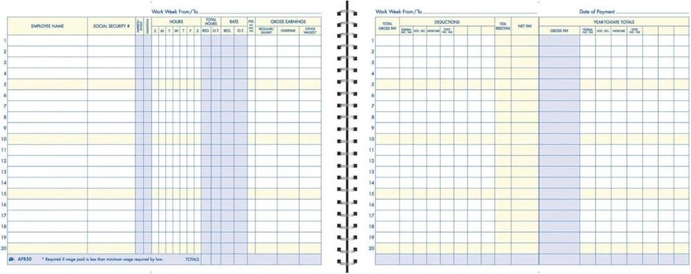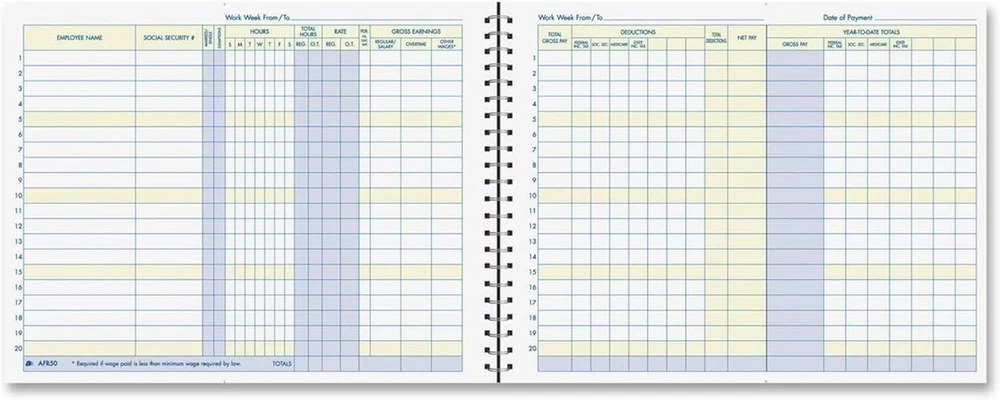 Weekly Payroll Record, 20 Employee Capacity, Spiral Binding, 11 x Inches, White, Tracks weekly hours, pay rates, taxes and other deductions Wire-o spiral binding allows book to lay flat so rows line up across the pages Summary page in back of book Blue and yellow printing designed to reduce eye strain Up to 20 employee capacity Business Forms provide the tools to help keep track of messages, finances, transactions, employees, taxes, and customers to businesses throughout the world. These products are the perfect way to create and maintain a professional image for small businesses and service providers. The Weekly Payroll Record tracks weekly hours, pay rates, taxes and other deductions for up to 20 employees. The special Wire-o spiral binding allows book to lay flat so rows line up across the non-dated pages. The back of the book provides a convenient summary page for quick totals at a glance. The Weekly Payroll Record features blue and yellow printing which is designed to reduce eye strain. Whether it's a multi-part form, notebooks, writing pads, record books, or any of the hundreds of items we offer, you can count on products to help!