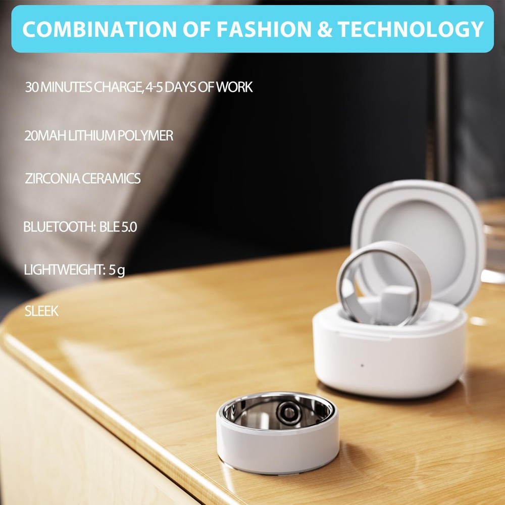 In today's fast-paced world, taking control of our health is more important than ever. Introducing our Smart Ring, a sophisticated wearable technology that transcends traditional fitness trackers, offering a comprehensive monitoring experience. This stylish and trendy smart ring allows you to proactively manage your well-being, from monitoring sleep patterns to tracking heart rate and analyzing biometric data such as blood oxygen levels. Unlike standard smartwatches and fitness trackers, the smart ring provides a holistic view of your health and translates the data into actionable insights. The ring's Pedometer Index calculates daily energy expenditure based on movement, while the Sleep Index offers detailed information on sleep stages. With continuous monitoring of various metrics, users can make informed decisions to improve their health. With its sleek design, long battery life, and high-quality materials, the smart ring is water-resistant, sweat-proof, and comes with a money-back guarantee and warranty. Elevate your health journey with our Smart Ring – the perfect companion for a balanced and active lifestyle. ※ HEALTH TRACKING ON YOUR FINGER —Track your well-being with advanced sensors, analyzing key body signals such as temperature trends, heart rate variability, blood oxygen trends, and sleep quality.Be kinder to your body and take precautions. ※ GREAT GIFT—Ideal present for birthdays, Valentine's Day, Mother's Day, Father's Day, Thanksgiving, Christmas, or New Year. Also perfect for weddings, graduation ceremonies, and housewarming parties.This sleep tracking ring will make your friends and family feel special and appreciated. ※ WEARABLE-FREE EXPERIENCE—The thinnest smart ring in the world, combining elegant design with titanium alloy. Lightweight, fashionable, and comfortable with up to seven days of continuous monitoring on a single charge. Compatible with Android/iOS. ※ BUILD HEALTHY LIFESTYLE—Smart Ring is not just a health monitoring device; it’s a proactive way of life. By recording and analyzing your health data, it motivates you to adopt better lifestyle choices for maintaining health, vitality, and balance. Let health be at the core of your life and let the Smart Ring be your trusted companion! ※ WATERPROOF IPX8 — Water-resistant and sweat-proof with an IPX8 level of protection, ensuring durability in various environments. Feel free to shower or wash hands.