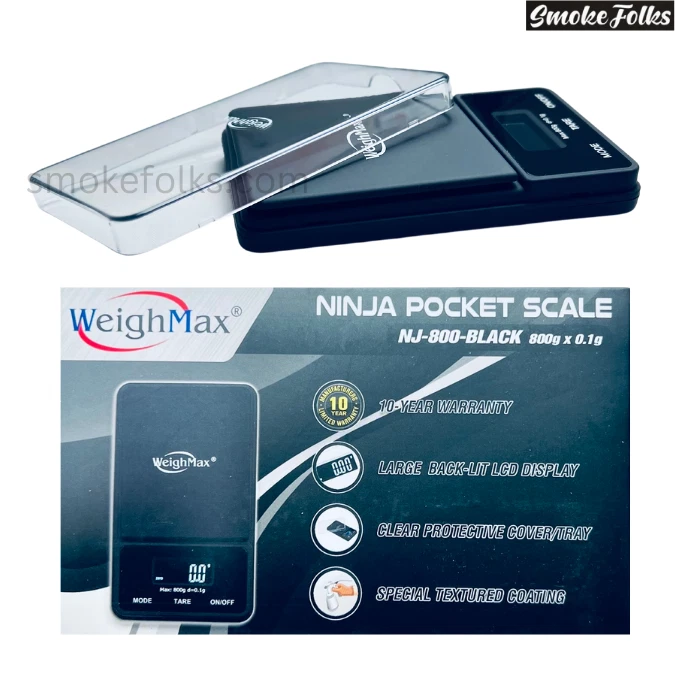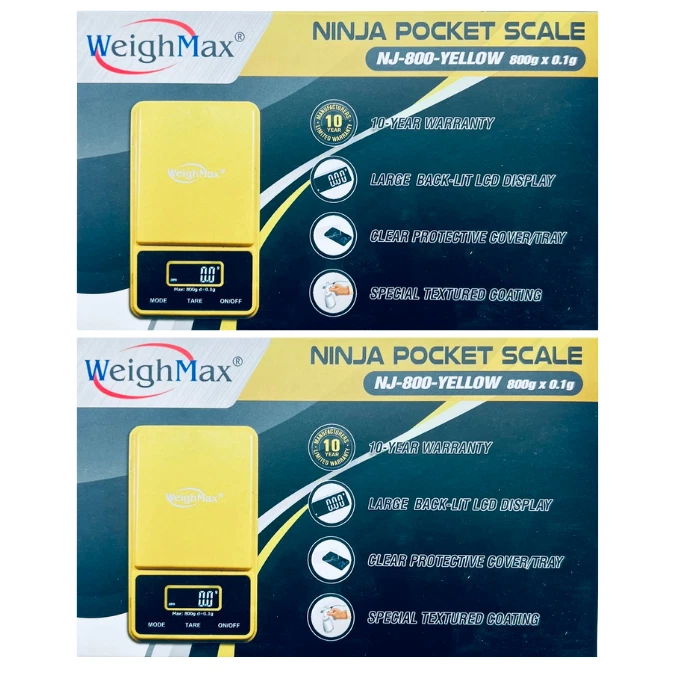 WEIGHMAX NJ-800 X 0.1G DIGITAL POCKET SCALE – PRECISION IN YOUR POCKET The Weighmax NJ-800 Digital Pocket Scale is the perfect combination of precision, durability, and portability. Designed with a capacity of 800 grams and a sensitivity of 0.1 grams , it delivers accurate measurements for professional and personal use. The large back-lit LCD display , protective cover, and user-friendly features make it an excellent choice for a wide range of applications. KEY FEATURES High Precision and Capacity: Accurately measures up to 800 grams with 0.1g sensitivity , suitable for jewelry, ingredients, and more. Large Back-Lit LCD Display: Ensures clear readability of measurements, even in dimly lit environments. Protective Cover Doubles as Tray: Comes with a clear protective cover that can also be used as a weighing tray for added convenience. Special Textured Coating: Provides a premium feel and extra grip for secure handling. Multiple Weighing Units: Easily toggle between grams (g) , ounces (oz) , troy ounces (ozt) , and carats (ct) for versatile use. TARE Function for Accuracy: Measure items in containers or subtract the weight of packaging with ease. Energy-Saving Auto Shut Off: Automatically powers off after a period of inactivity to save battery life. DIY Calibration: Features a simple calibration process to maintain long-term accuracy. Battery-Powered and Portable: Operates on 2 AAA batteries (included), ensuring convenience and portability. SPECIFICATIONS Feature Details Capacity 800 grams Readability 0.1 grams Weighing Units g, oz, ozt, ct Display Large Back-Lit LCD TARE Function Yes Protective Cover Doubles as a weighing tray Auto Shut-Off Yes (energy-saving feature) Calibration Easy DIY Calibration Power Source 2 AAA batteries (included) WHAT’S INCLUDED IN THE BOX? Weighmax NJ-800 Digital Pocket Scale Clear Protective Cover/Weighing Tray 2 AAA Batteries User Manual WHY CHOOSE THE WEIGHMAX NJ-800 X 0.1G DIGITAL POCKET SCALE? Exceptional Precision and Capacity: Measures up to 800 grams with 0.1g accuracy , ideal for various tasks. Compact and Portable: Pocket-sized design with a protective cover for on-the-go convenience. User-Friendly Design: Back-lit LCD, multiple units, and TARE function ensure effortless operation. Durable Build: Special textured coating adds durability and a premium feel. Energy Efficiency: Auto shut-off feature prolongs battery life for extended use. The Weighmax NJ-800 X 0.1G Digital Pocket Scale is the ideal tool for professionals and hobbyists who value precision and portability. Its sleek design and advanced features make it a must-have for weighing tasks, big or small.