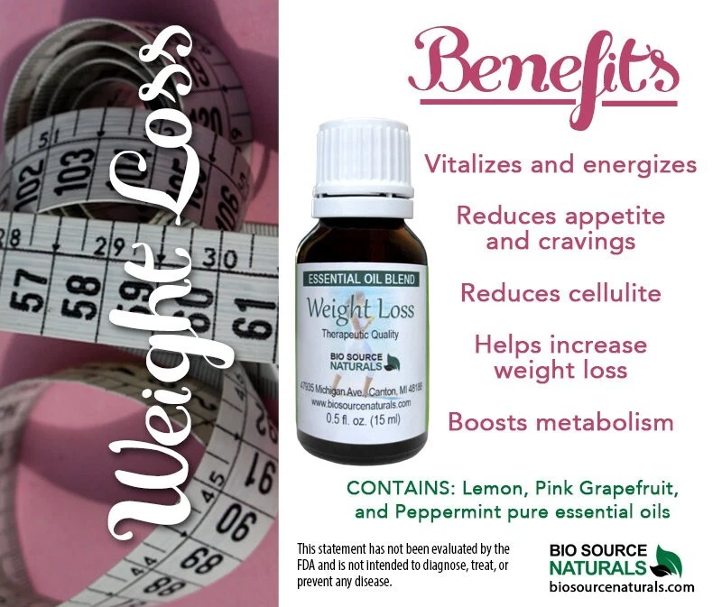 Weight Loss Essential Oil Blend Roll-On - Aromatherapy - Therapeutic Quality - 0.3 fl oz (9 ml) Amber Glass Roll-On Bottle with Stainless Steel Roller Ball and Cap Description: Weight Loss Blend combines the citrus powers of Lemon and Pink Grapefruit with Peppermint. All oils are known to help reduce the appetite, food cravings and sweet cravings after inhalation. These oils are also considered beneficial in the reduction of cellulite. Properties of Essential Oils in Weight Loss Essential Oil Blend Lemon : Clears the mind, boosts metabolism, detoxifies, and dissolves fat. * Pink Grapefruit : Energizing and detoxifying; dissolves fat. * Peppermint : Vitalizes and energizes, reduces appetite, and curbs cravings. * Packaged: Available in 0.3 fl oz (9 ml) amber glass roll-on bottle with stainless steel roller ball and cap. Safety shrink wrapped. Directions: Topical application is recommended. This roll-on is diluted in Sweet Almond oil and is ready to apply directly to skin. Weight Loss Essential Oil Blend Safety Information: Avoid use on hypersensitive, diseased or damaged skin. Do not apply to face or near the face of infants or children. Dilute concentrate with carrier oil or direct skin contact. Phototoxic, so avoid using it when exposed to sunlight 12 hours prior to topical application. Do not use if using ventricular fibrillation, or if diagnosed with GERD (Gastroesophageal reflux disease). Should not be used during pregnancy or if epileptic. For external use only. Disclaimer : These statements have not been evaluated by the FDA. None of these products are intended to diagnose, treat or cure disease. Biosource Naturals was founded by a Naturopath, Aromatherapist, EFT Practitioner, Reiki Master in 2006. We supply Pure essential oils verified by GC and/or other QC testing .