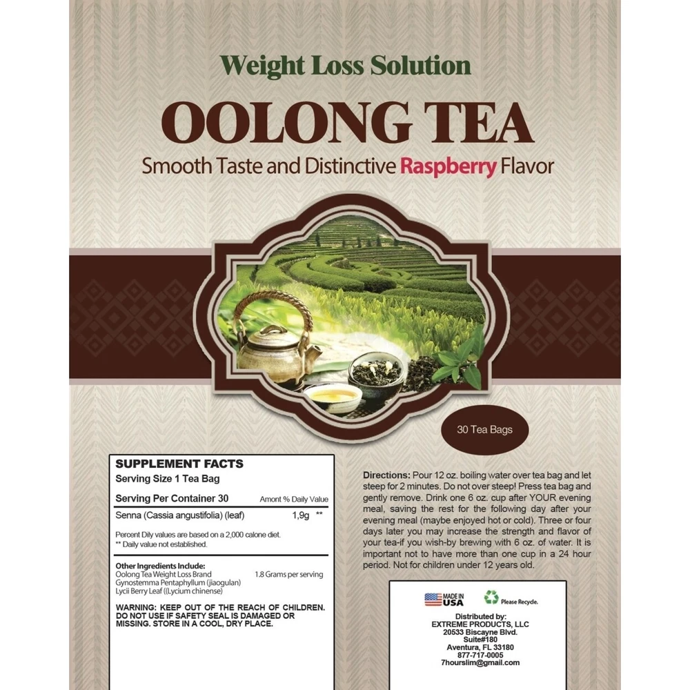 Keep your health goals within reach with this oolong slimming tea by Totally Products. Stay energized as you burn fat with the help of this smooth-tasting raspberry tea. \nFeatures: \nEE levels of about 3 percent higher\nParticipants burned and average of 67 more calories\nParticipants increased fat oxidation by 12 percent\n\nAdditional Information:\nOolong tea leaves are plucked, kept under carefully controlled conditions and allowed to oxidize. These leaves are not intentionally broken, leaving most of the cell structure intact. These processing differences make this category of tea beneficially different even than many of the other teas. The Chinese have long believed that oolong tea is beneficial in reducing and main OpenSky on eBay Our eBay Store About Us Contact Us Weight Loss Solution Oolong Wulong Raspberry Slimming Tea (30 tea bags)