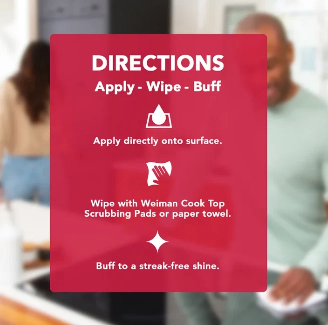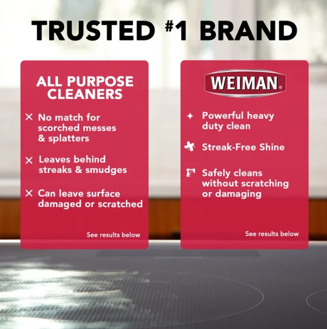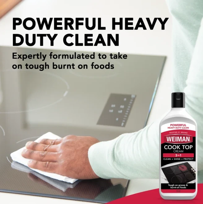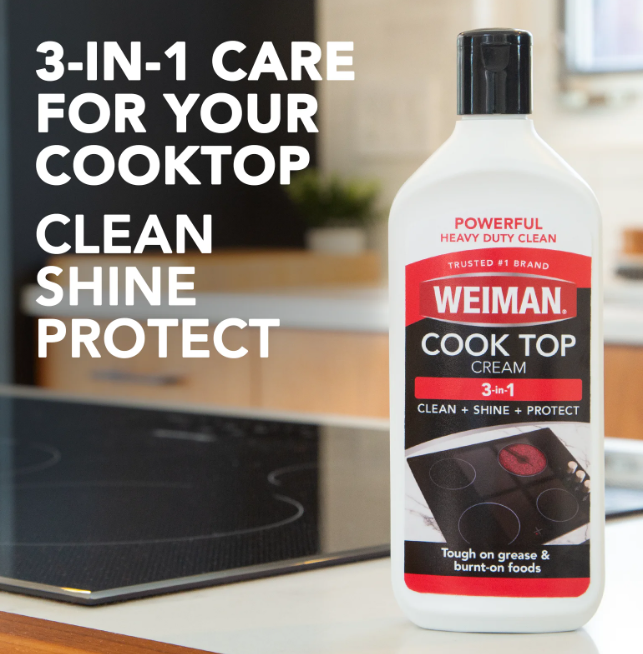 Weiman Cooktop Cleaner and Polish Cream for Glass, Ceramic and Induction Surfaces -15 oz, Unscented About this item : REMOVES TOUGH BAKED-ON FOOD & SPLATTER - Weiman cooktop cream works to keep your cooktop surface free from baked-on greasy or burnt messes and food spills & stains SHINES - Dramatically cleans, shines and protects glass/ceramic smooth top ranges in one easy step. SURFACE SAFE - This cook top cream is powerful & surface safe for cleaning grease stains and baked on messes. FOR USE ON: All major glass/ceramic cooktop manufactures including GE Whirlpool, Frigidaire, Thermador & more 15 Oz STREAK FREE RESULTS - All purpose cleaners are not for all purposes, and can leave residue and streaks behind. Choose Weiman for the best results on your valued surface! Product details : Enhance the natural beauty of cooktop surfaces in your home with the Weiman Glass and Ceramic Cooktop Cleaner and Polish. The Weiman Heavy Duty Glass Cook Top Cleaner and Polish is formulated with a streak-free, non-abrasive ingredients to clean, shine and protect all glass/ceramic cooktop surfaces without scratching or damaging them. Safely clean up stubborn stains, splattered food, and greasy, oily residue to revitalize and maintain your surfaces that keep your kitchen shining brighter and longer.