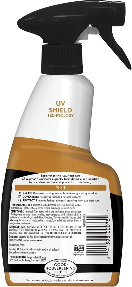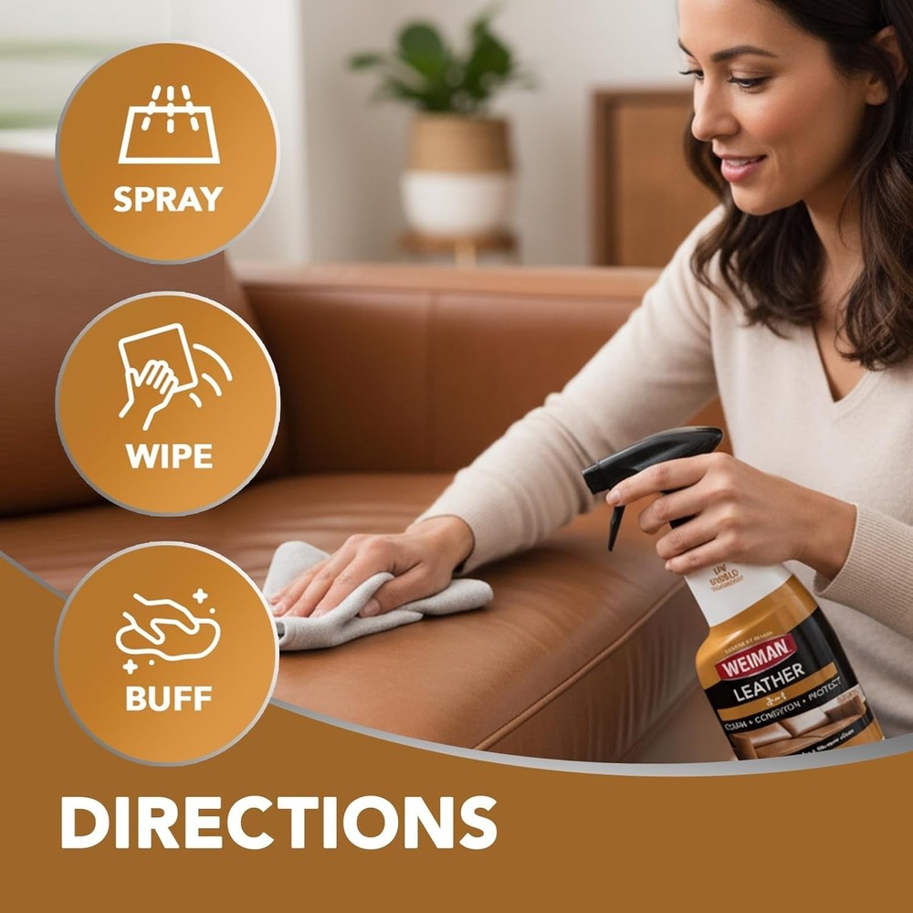 Weiman Leather Cleaner and Conditioner for Furniture - Cleans Conditions and Restores Leather Surfaces - UV Protectants Help Prevent Cracking or Fading of Leather Car Seats, Shoes, Purses Brand Weiman Item Form Liquid Scent Citrus Specific Uses For Product Upholstery Material Feature Unscented About this item Simple & Non-Toxic - Condition & protect in one simple step to maintain any finished leather surface Use On - Use regularly on accessories such as leather, purses, shoes, boots, briefcases & handbags Protect - UVX - Sunscreen protects all types of leather from sun damage, fading, drying & cracking Restore - Safely removes dirt, soil & residue to soften, strengthen & moisturize neglected leather Recommended - Finished leather surfaces including car interior shoes boots briefcases handbags & coats Product Description Weiman Leather Cleaner & Conditioner allows you to clean, condition and protect smooth finished leather surfaces, providing UV protection & long lasting leather restoration in just one simple step. From shoes to accessories to car interiors, our formula rejuvenates leather with natural oils while safely removing dirt, soil & residue build up. Use Weiman Leather Cleaner & Conditioner spray on a regular basis to quickly & easily maintain your favorite leather accessories, as well as promoting flexibility, leaving your leather feeling and looking sharp. Six natural oils moisturize, soften & restore leather while the UVX-15 sunscreen protects it from the damaging effects of the sun. Weiman Leather Cleaner & Conditioner is a trigger spray that can be applied directly onto smooth finished leather surfaces such as coats, furniture, automobile/car interiors, motorcycle seats, briefcases, couches, shoes & purses. Weiman Products is the perfect home, chef, pro, scratch resistant, cleansing, household, professional, and at work solution for all of your cleaning and buffing needs. The best specialty cleaning products you will buy online or in a store. When cleaning is your therapy, Weiman is your method, just wipe away and not a fingerprint in site! Weiman wants each of the surfaces in your home to look its best. That’s why we have developed cleaning products that go beyond simply cleaning to beautify and protect each of your delicate, difficult to care for surfaces. From stainless steel to leather to granite, each of our products is formulated specifically for one surface and one surface only; allowing you to achieve the perfect results that your home deserves. A clean home is great, but we want it to look more than clean, we want it to look spectacular! Weiman leaves a polishing shine and acts as a protector where other cleaners do not compare.