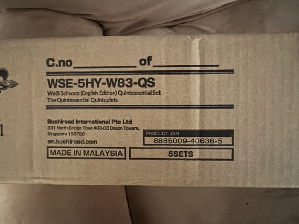 FACTORY SEALED! Slight damage to the box, but nothing that would compromise the product. Message me for inquiries Will be shipped in a bubble wrapped secure box and insurance will be included in shipping. 5 sets of “The Quintessential Quintuplets TCG: Quintessential Set” guaranteeing at least one SP per set (5 Minimum).